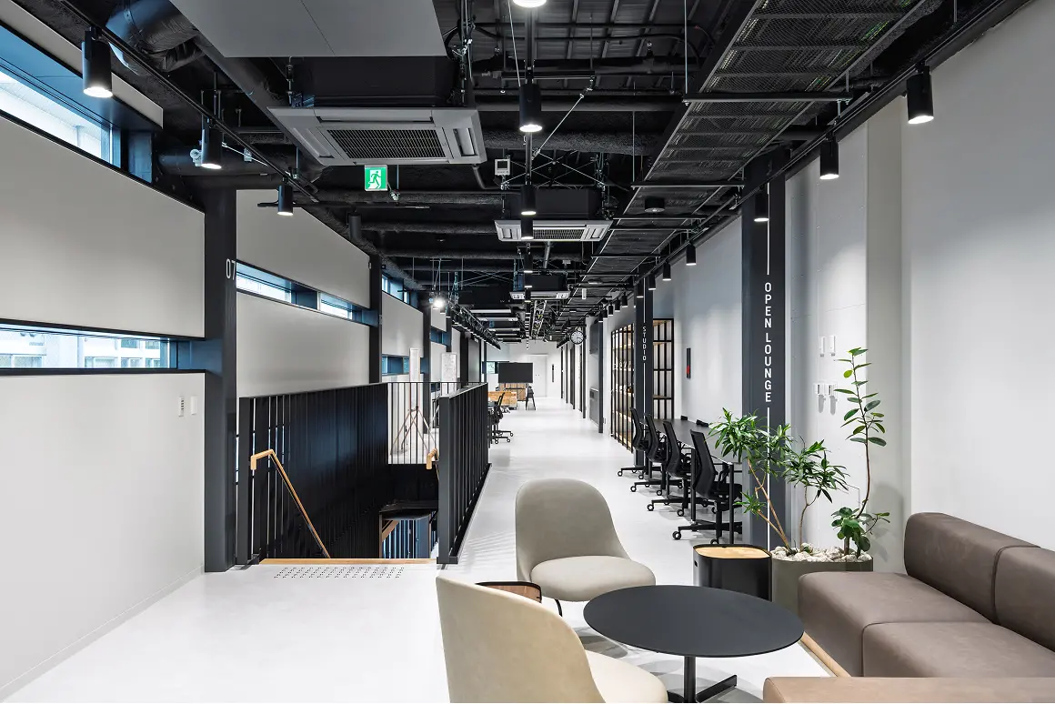 ・ガラスファサードにより外部との視線を遮らず、活動が可視化された“開かれた建築”・壁を極力設けず、仕上げ材や床レベルの緩やかな変化によってゾーニングを実現・建築設計・インテリア・サインの異なる視点を掛け合わせ、それぞれの専門性をいかした自由な提案プロセスを採用