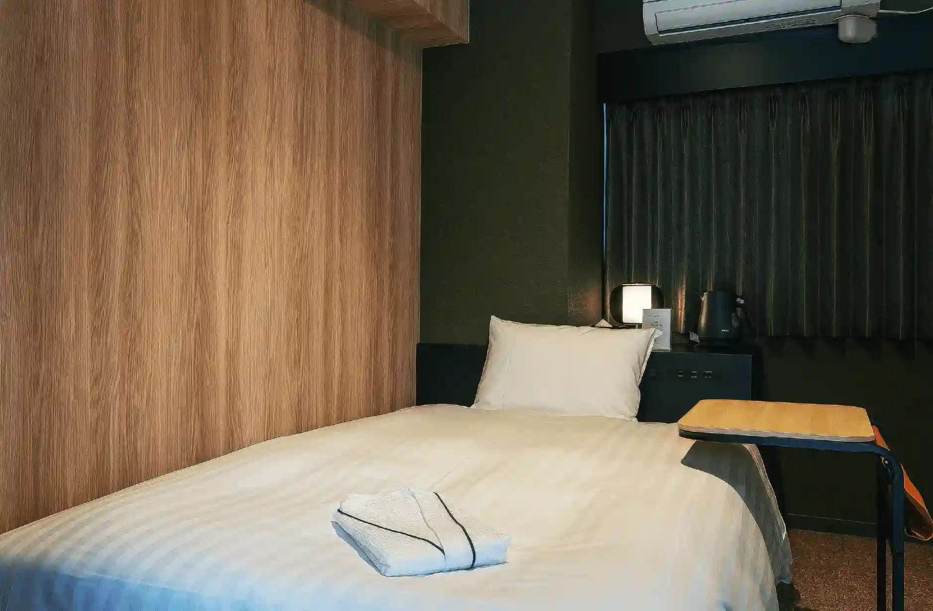 ライティングデスクを撤去し、ミニバーをヘッドボードと一体化させることで、限られたスペースを効率良く整理しました。 生まれたゆとりでベッドをセミダブルへサイズアップし、足元の荷物動線も確保。さらに家具の高さを抑えて視線の抜けをつくり、奥の壁面に濃い色のアクセントクロスを施して奥行きを強調することで、実際の広さ以上にゆったりと感じられる空間を演出しました。限られた平米数で居住性を最大化し、客室単価の向上を実現する空間設計です。