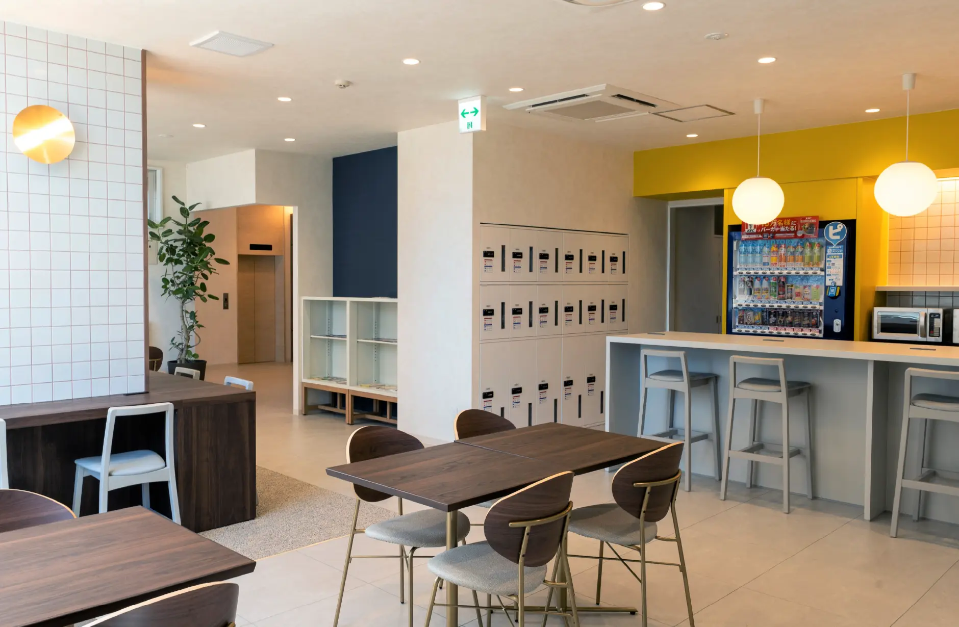 滞在の自由度を広げる、充実のラウンジエリアです。 ビジネス利用に必須のWi-Fi・電源を完備しつつ、グループでの食事もゆったりと楽しめる、優雅で広々としたレイアウトを採用しました。客室の機能をあえてこの場所にアウトソーシングすることで、運営コストを抑えながら、ゲストには「選べる自由」という付加価値を提供。電子レンジやセルフロッカーなどの機能も集約し、仕事から休息まで、思い思いの時間を豊かに過ごせる拠点として計画しています。