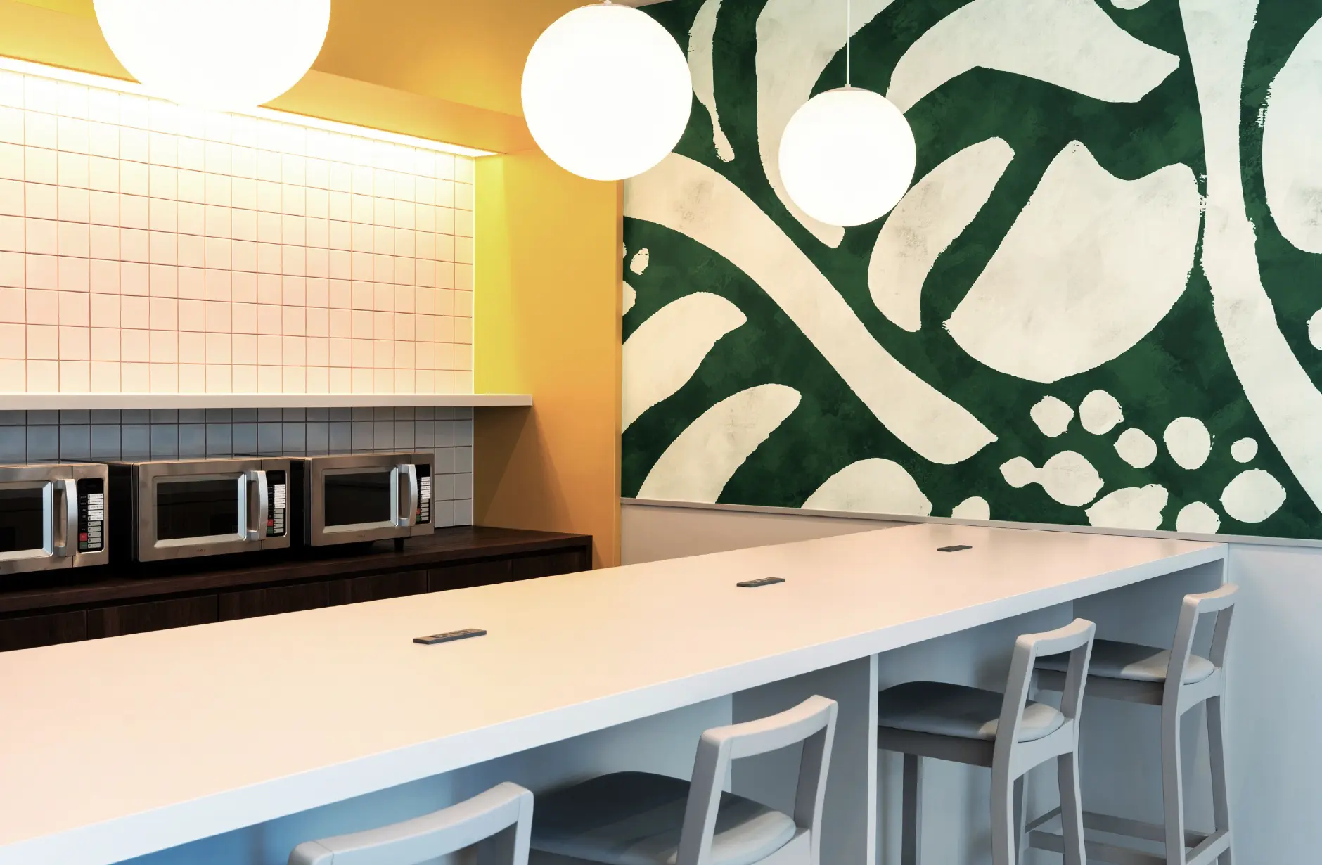 イートインでの食事が単なる「食事を済ませる時間」にならないよう、空間演出には特にこだわりました。 特注のインクジェット壁紙や鮮やかなポイントカラーを採用し、心弾む楽しげな雰囲気を演出。近隣のホテルとは一線を画す、独自のデザイン性が、滞在そのものを「お洒落な体験」へと引き上げ、ゲストに有意義な時間をもたらします。