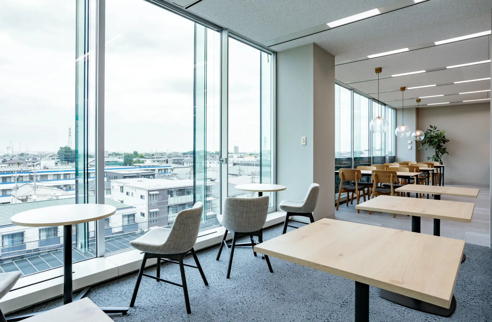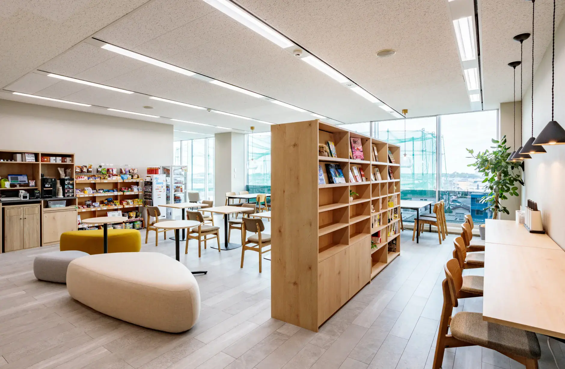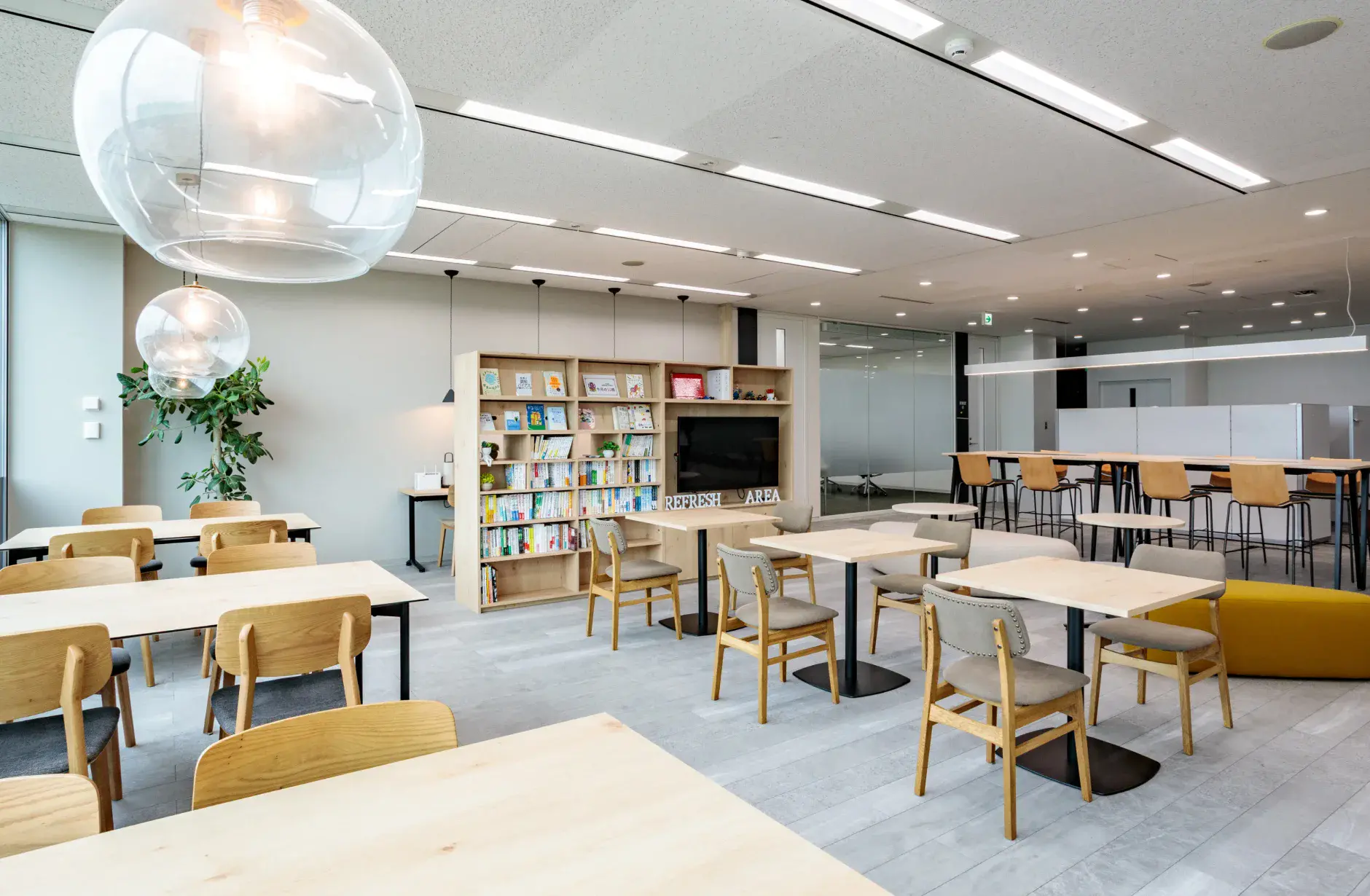 大きい窓に面する席には、視界を遮らないガラスペンダントライトで窓側の席を引き立て、周囲の什器と繋げられる拡張しやすいエリアとしています。