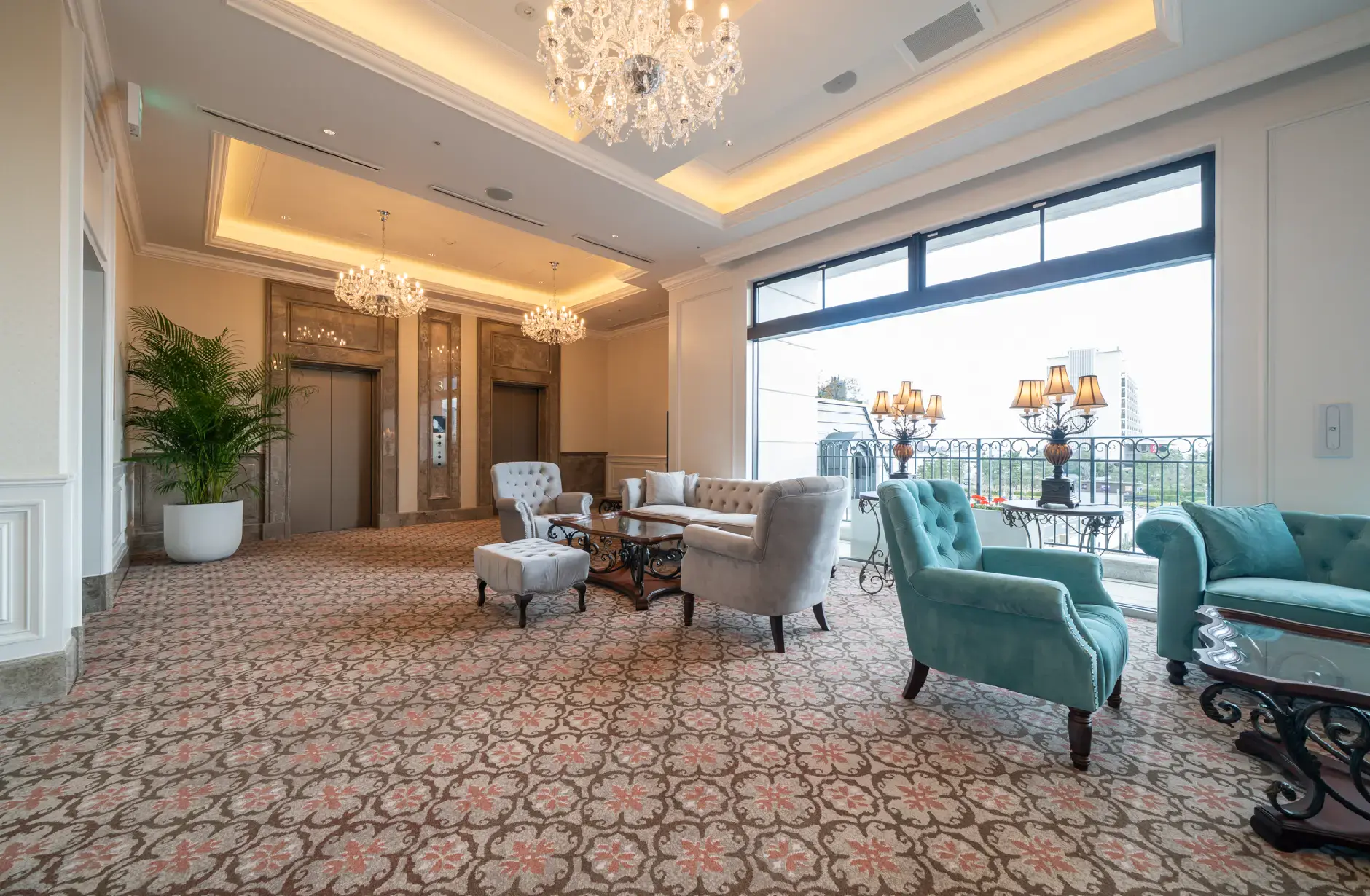 シャンデリアなどのクラシカルな要素と調和し、統一感を生みだすカーペット。