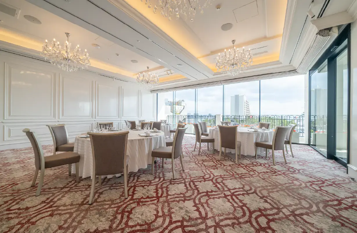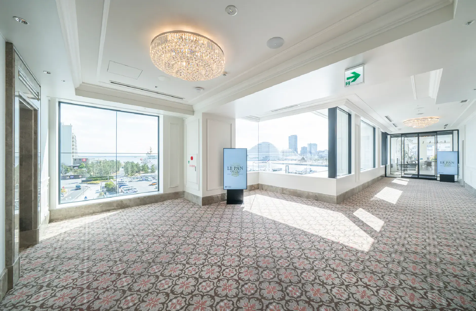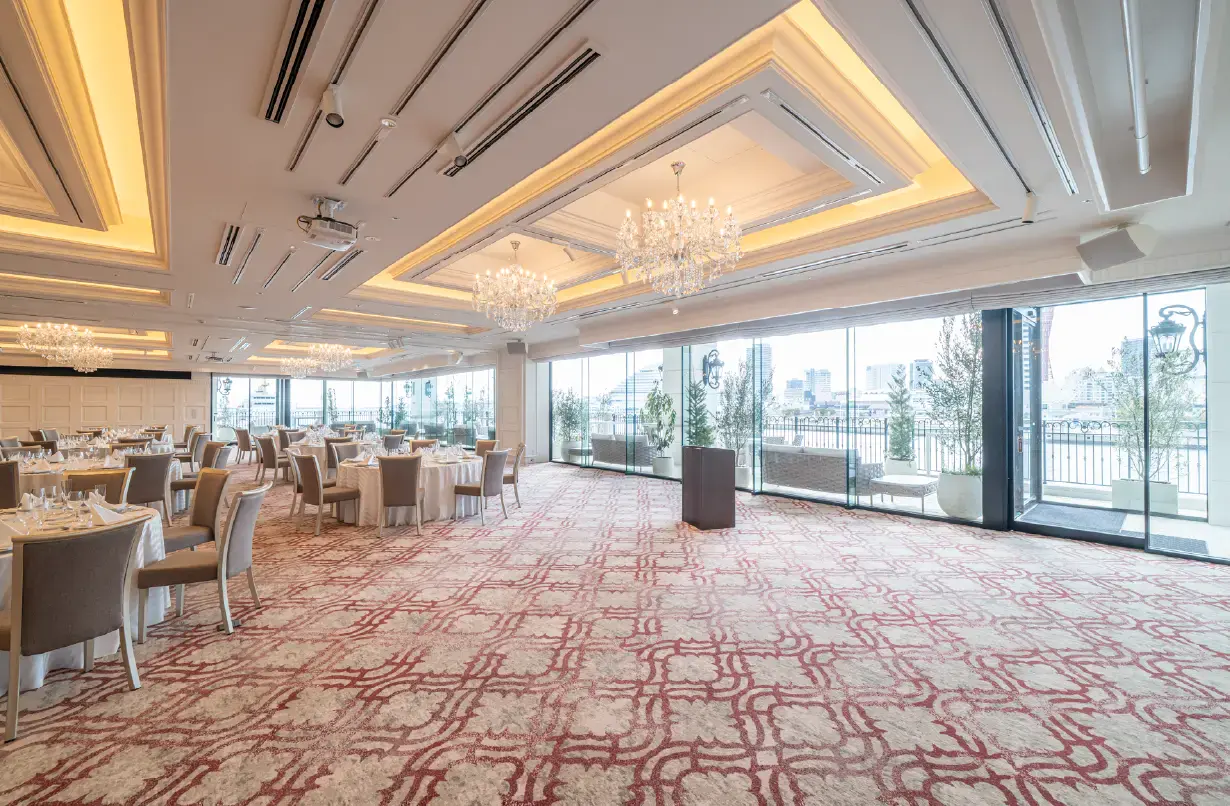目の前に広がる神戸港の絶景を楽しみながら、特別なひとときを過ごせるバンケット「ラ・テラスホール神戸」のエレベーターホール・ホワイエやロビー、イベントホールの特注カーペットデザインを、弊社がご提案しました。「華やかでかわいらしく、エレガントな空間にしたい」とのご要望をいただき、大空間のスケール感をいかした、クラシカルで優雅なダマスク柄のデザインをご提案。窓の外に広がる絶景に映えるように色味を何度も調整し、非日常的で優雅な空間を足元から演出しました。