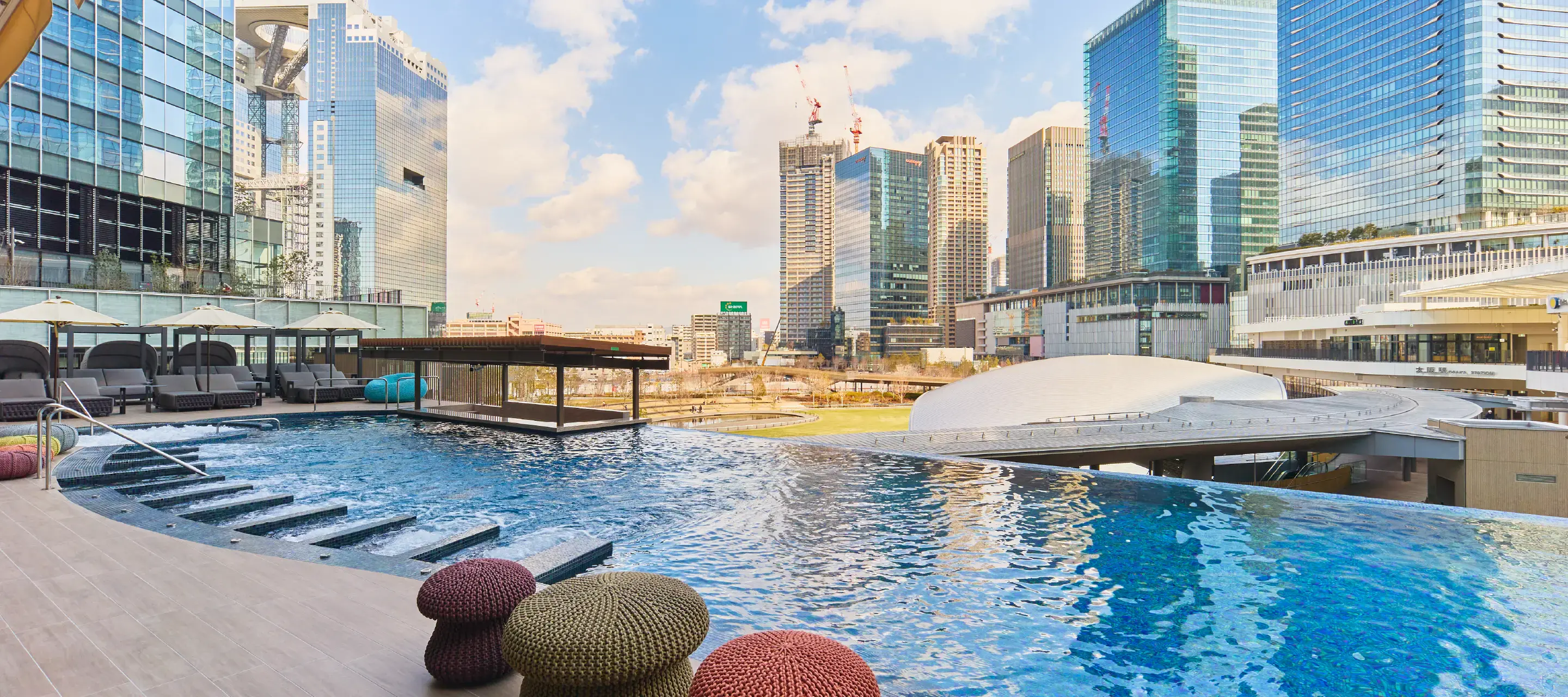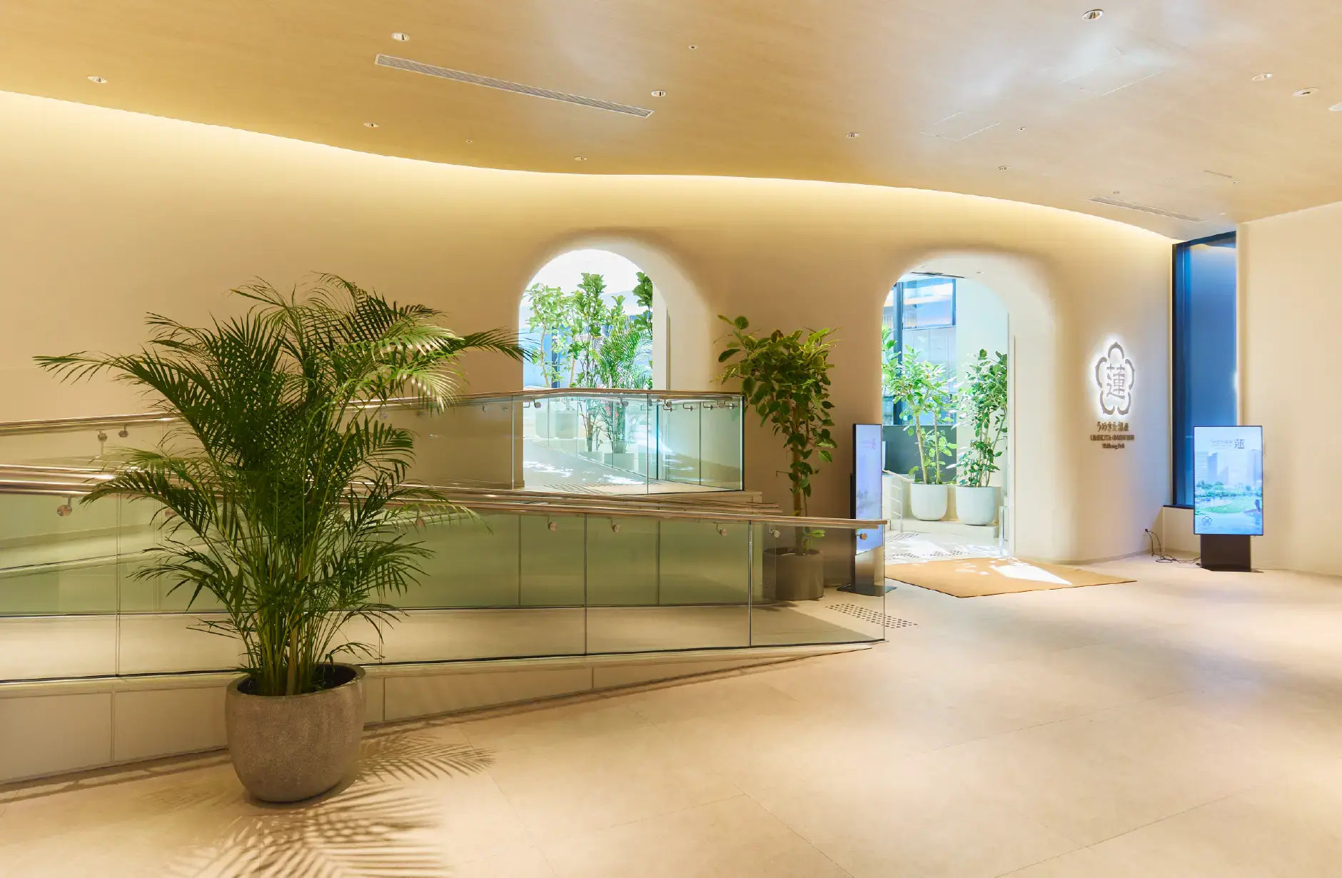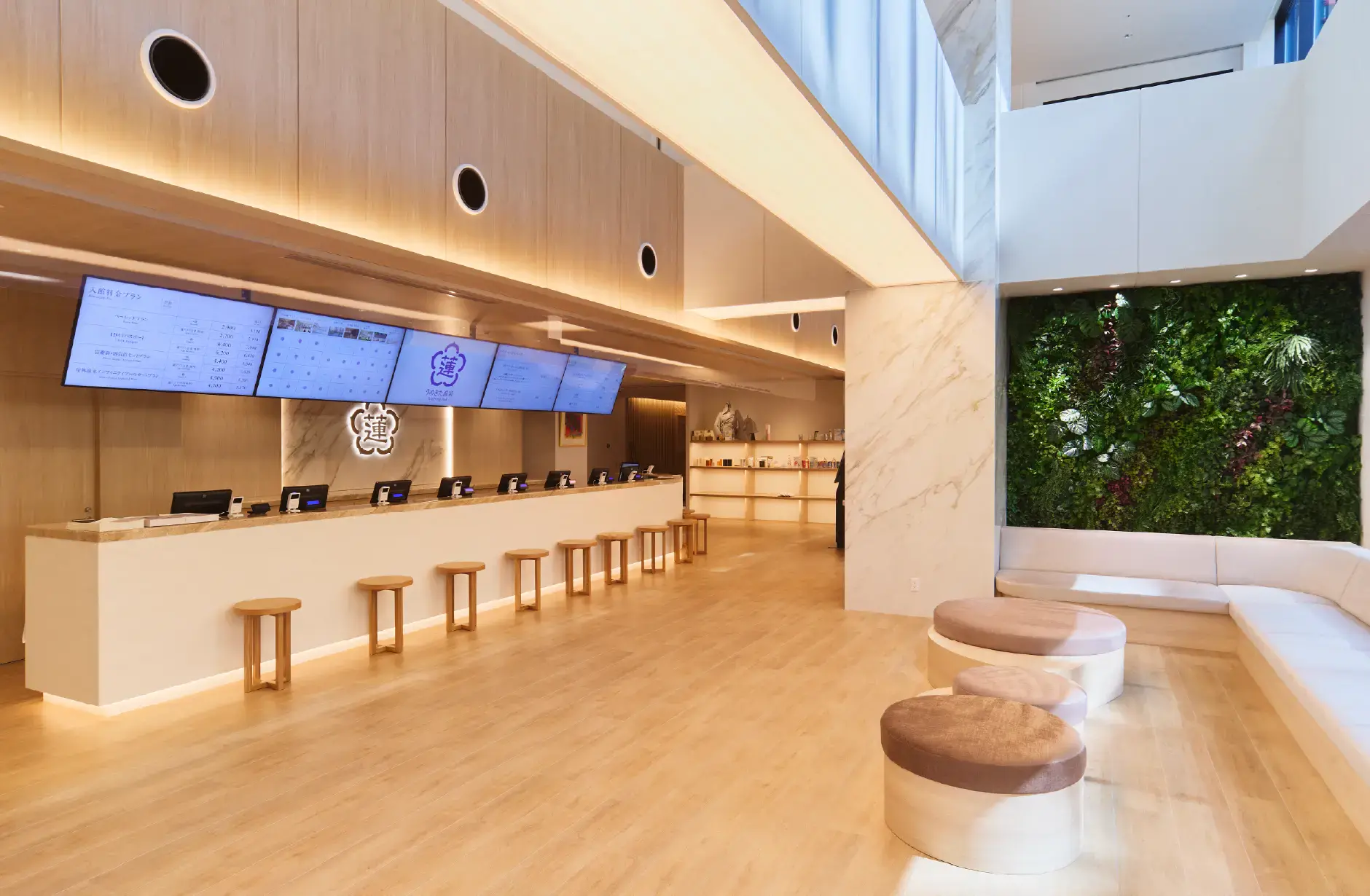 「うめきた温泉 蓮 Wellbeing Park」は、大阪の中心地・梅田エリアに位置する、都会の喧騒を離れて癒しのひと時を提供する施設です。リラックス効果の高い天然温泉を中心に、最新のフィットネス機器を備えたフィットネスジム・プール、レストランからトリートメントサロンまで上質なリラクゼーション空間が広がっています。オープンエアーでさまざまな角度からウェルネスにアプローチする本施設に、ぬくもりと心地よさが共存する内装デザインを弊社がご提案しました。