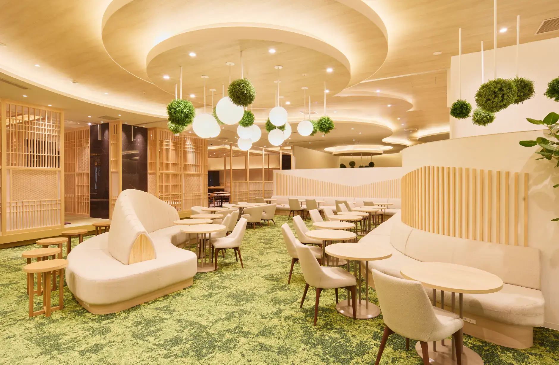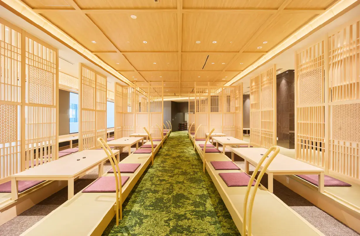 施設内に複数ある御食事処は、「和」という共通のテーマのもと、エリアごとに素材や色合いに変化を持たせることで、それぞれ趣の異なる空間を演出しました。