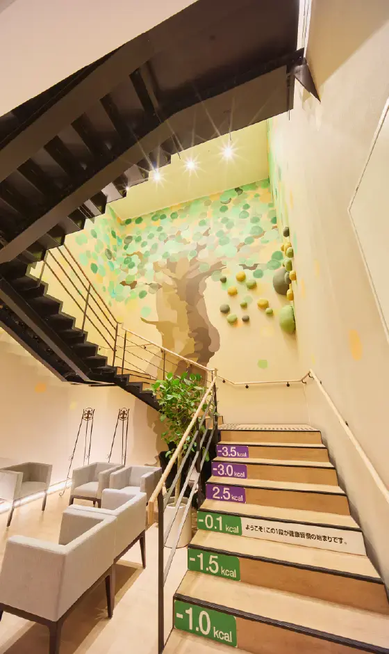 施設の中央に位置する屋内階段には、特注デザインのインクジェットクロスをご採用いただきました。吹抜階段の高さをいかし、空間全体を1本の樹に見立てた「ウェルネス」を象徴する生き生きとしたデザインが特徴です。