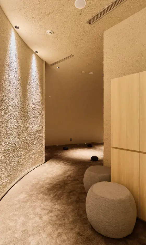 落ち着いた雰囲気でまとめたメディテーションルームには毛足の長いカーペットをご採用いただきました。踏み心地の良さを感じながらリラックスして過ごせる空間に仕上げました。