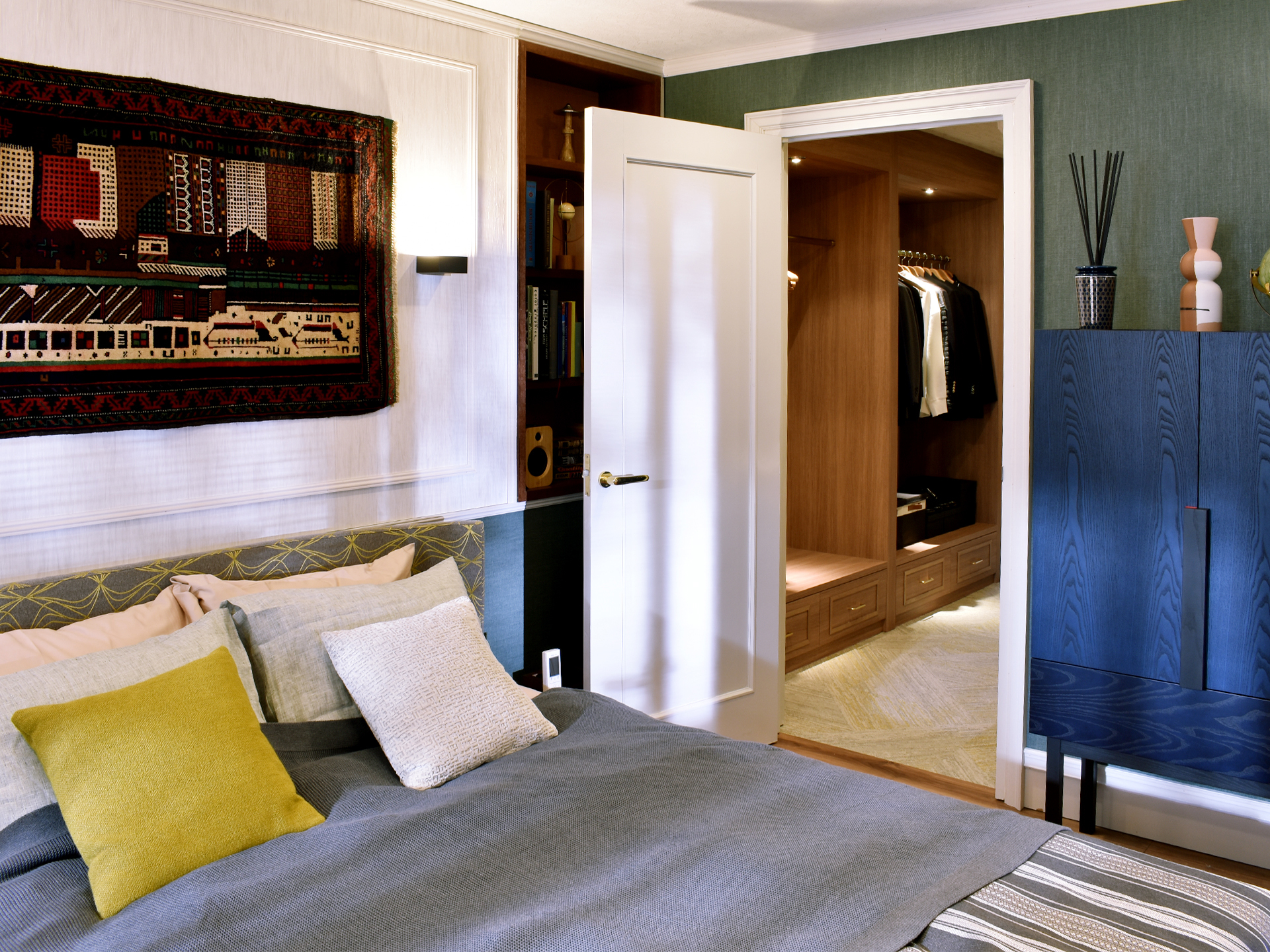 こちらは東郷の寝室。ディープグリーンがポイントになったカラーコーディネートで、まるで海外のホテルのような異国情緒あふれるインテリアが目を引くお部屋です。