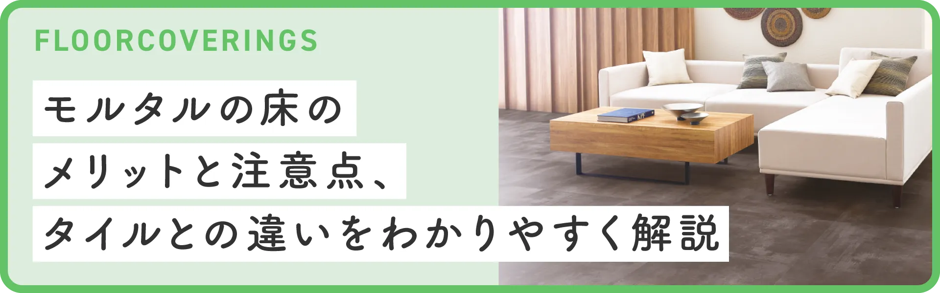 この記事では、モルタル床の特徴やタイルとの違いをわかりやすく解説しています。モルタル柄のフロアタイルを用いたコーディネート例とあわせて見ていきましょう。