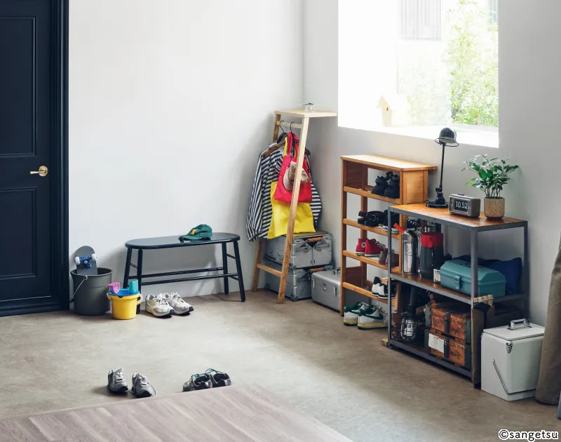 モルタル柄特有の無機質な印象を活かし、玄関スペースを引き締まった空間に仕上げることも可能です。タイルのような目地がなく、継ぎ目が少ないため、汚れやすい空間もお手入れがしやすいというメリットもあります。