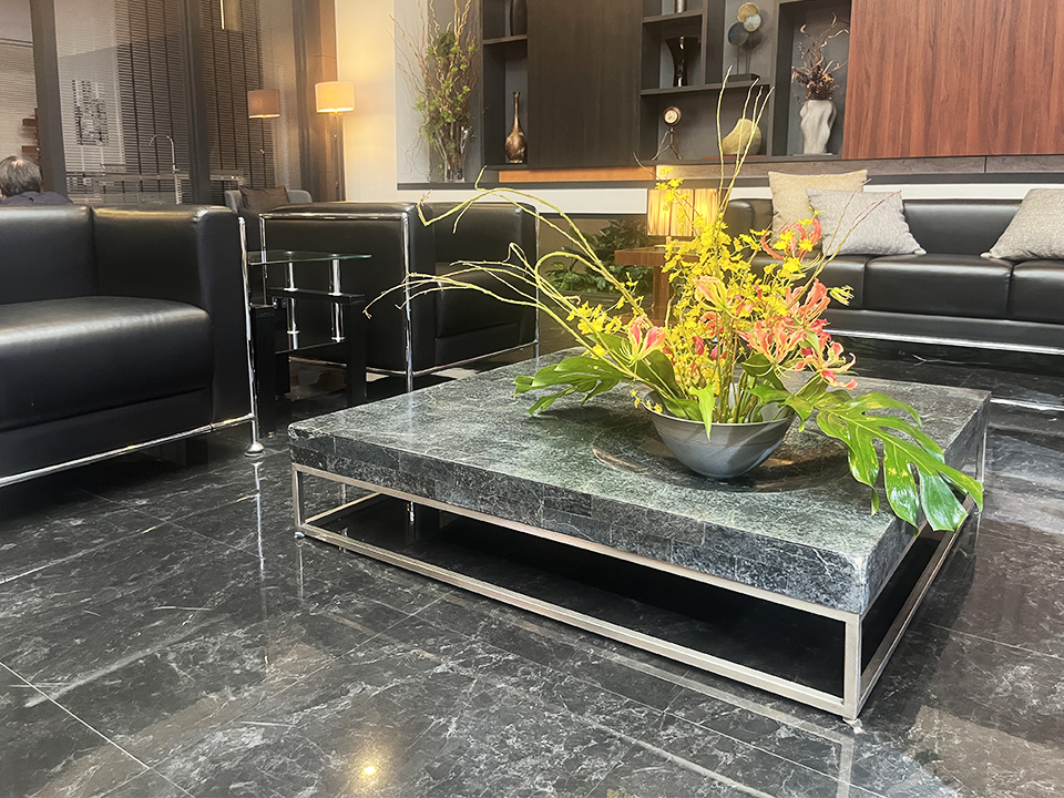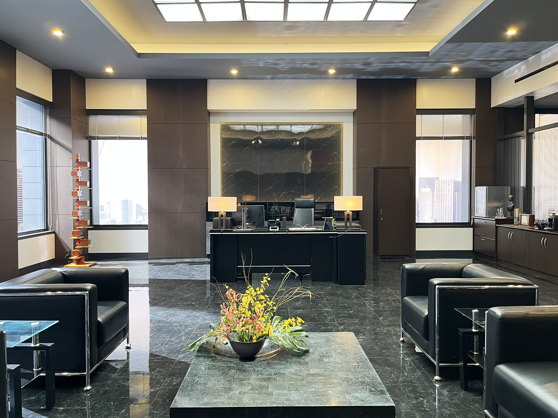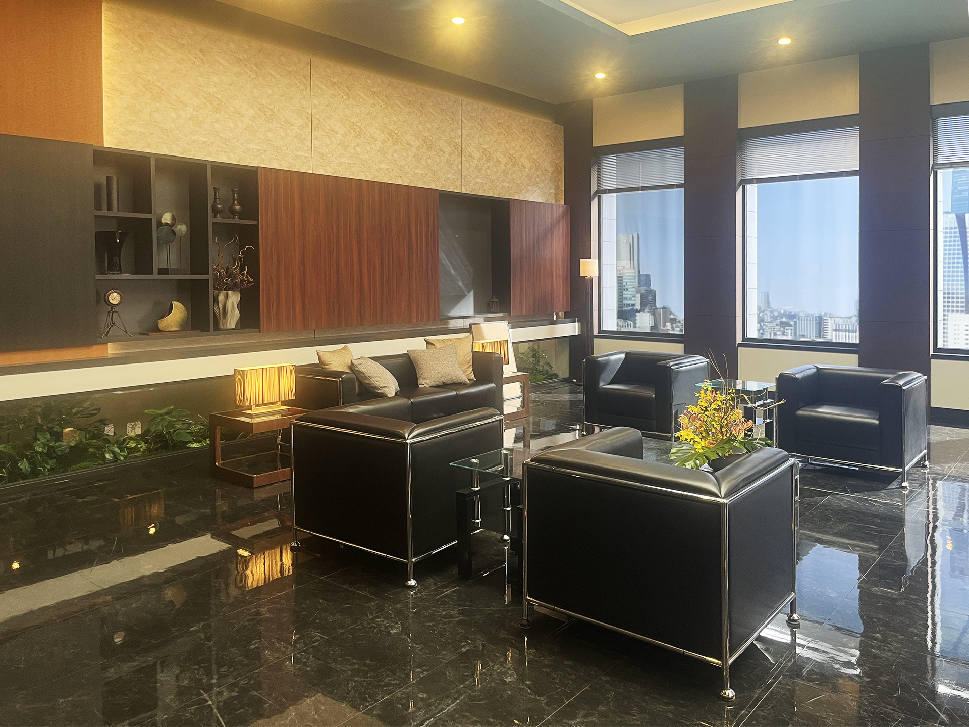 黒を基調とした応接スペース。光沢のある大理石調のフロアタイルが空間の美しさを一層引き立てています。