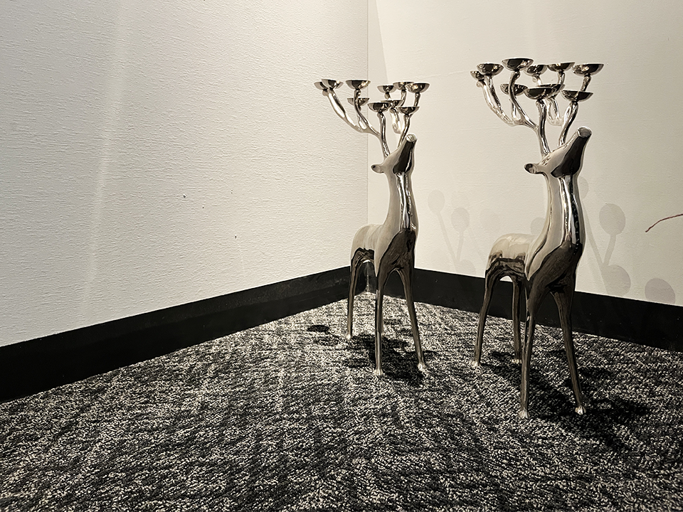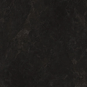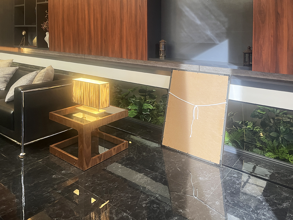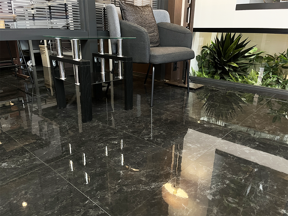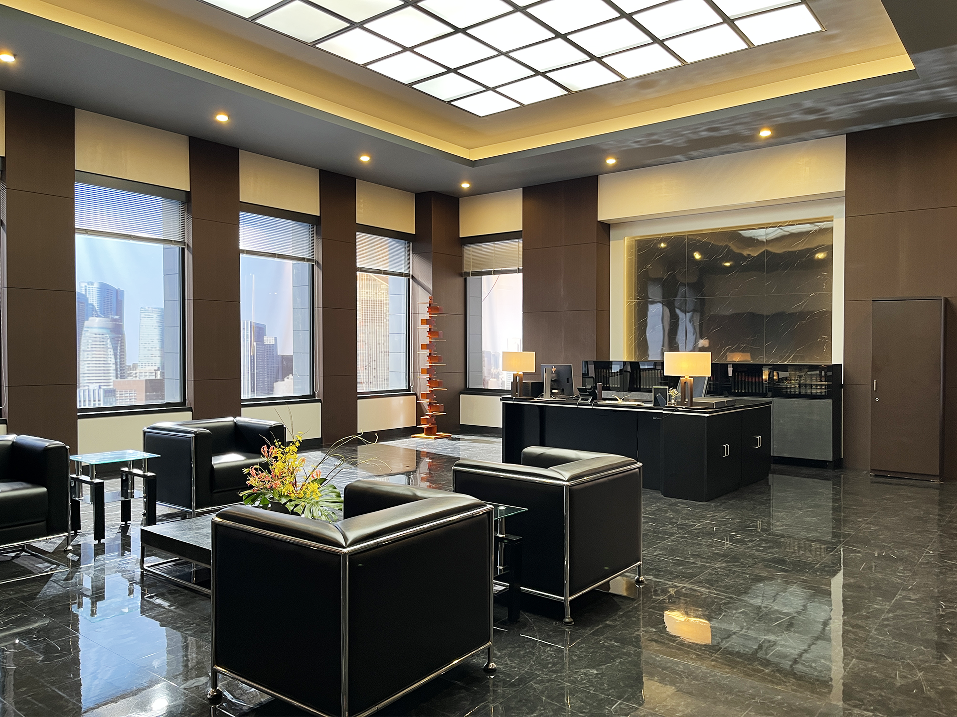 黒を基調とした応接スペース。光沢のある大理石調のフロアタイルが空間の美しさを一層引き立てています。
