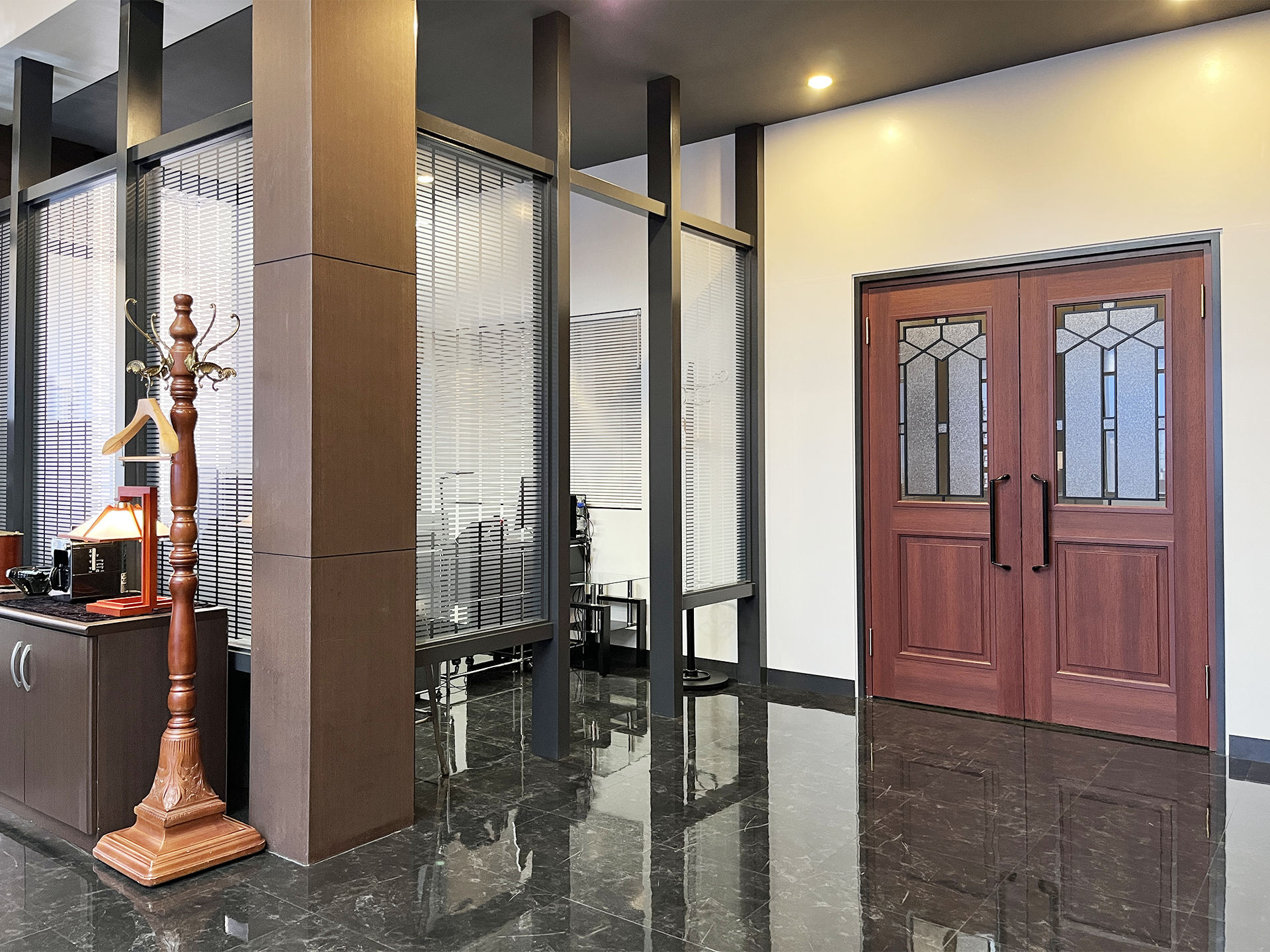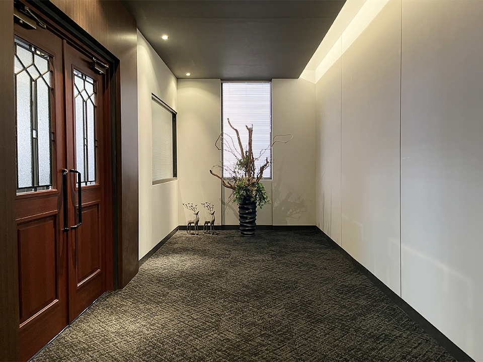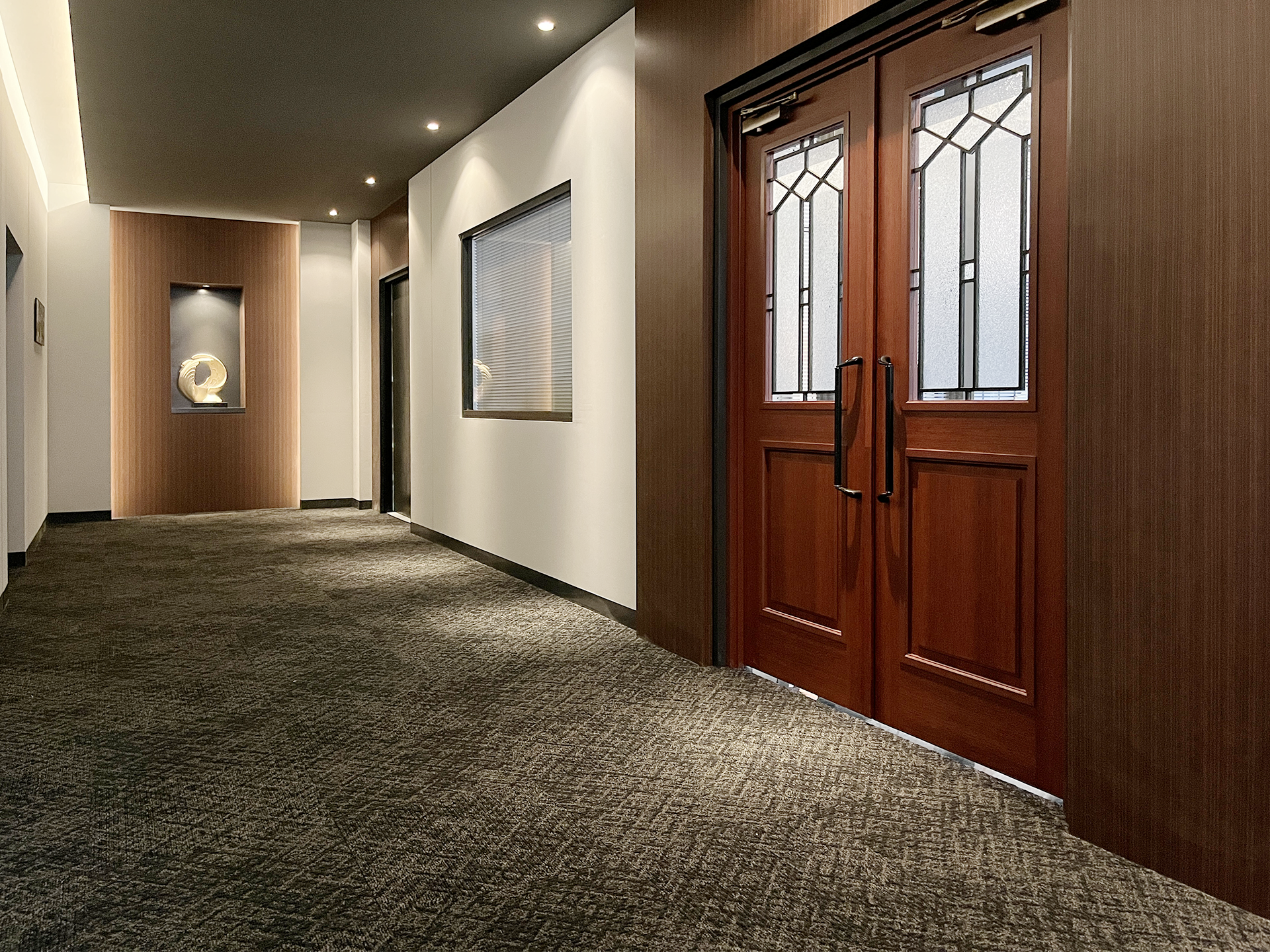 社長室へと続く廊下には、スタイリッシュなカーペットタイルと存在感のある扉が採用されており、洗練された雰囲気を演出しています。