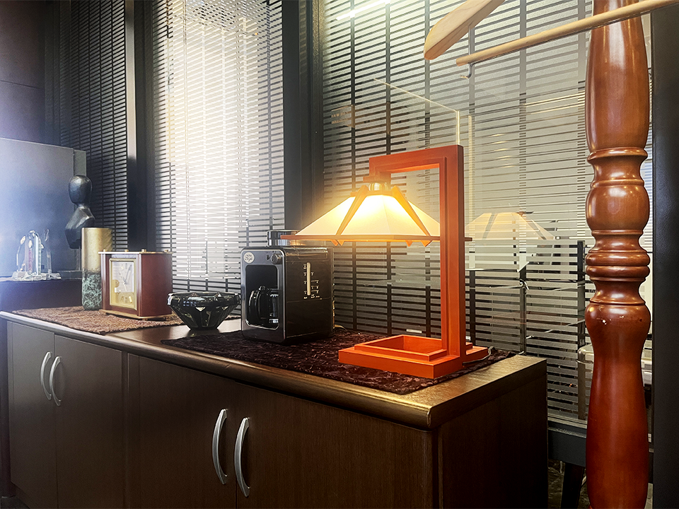 名作の家具や照明が各所に配置され、上質かつラグジュアリーな雰囲気の執務スペースです。