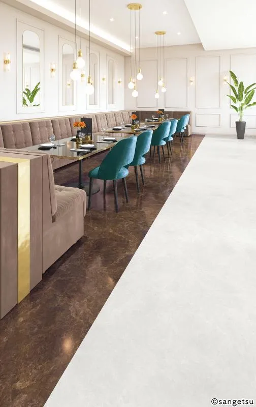 繊細な斑模様と透明感が美しい多配色のマーブル柄です。重厚感や高級感を演出しつつ、手軽なお手入れで衛生的な状態を保てます。玄関などの床材として使用したり、キッチンなどの水まわりに部分的に取り入れたりするのもおすすめです。