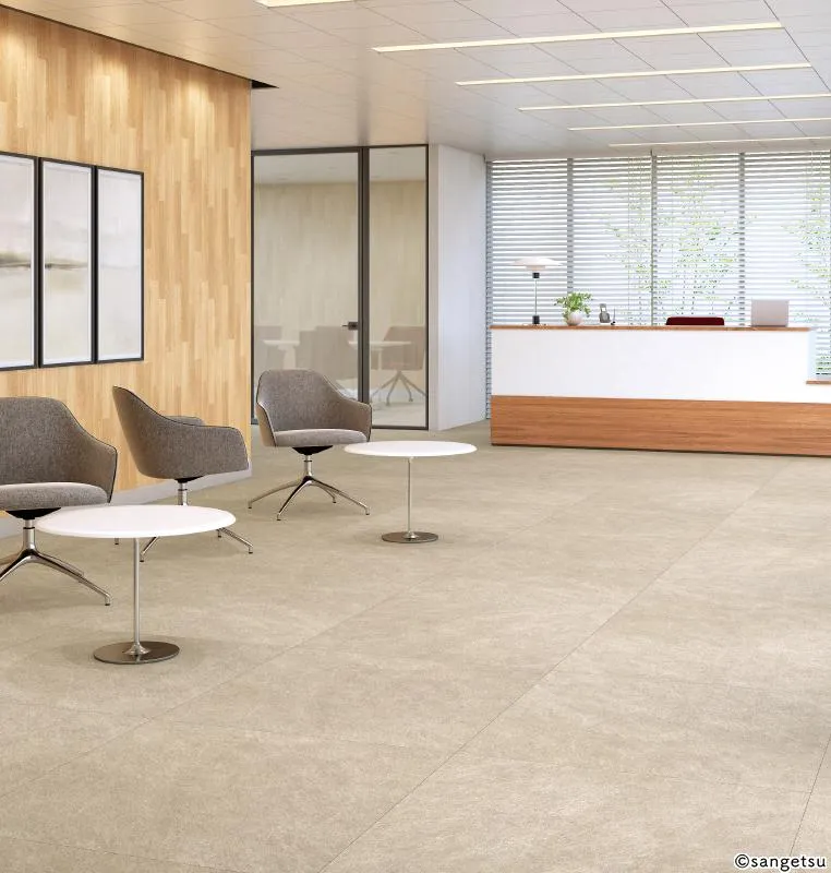 穏やかでクセのない、砂岩調の大判タイルです。住宅をはじめ店舗やオフィスなど、幅広いシーンでご利用いただけます。自然で落ち着いた風合いの空間をつくりたい場合におすすめです。