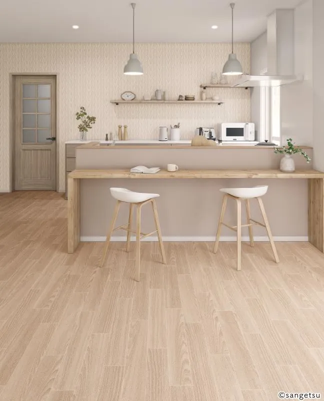 ドライな質感の木目調で、白い目地に特長があるクッションフロアです。ベージュ系のワントーンコーディネートにも馴染むため、ナチュラルテイストのお部屋づくりをしたい方にも適しています。リビングやダイニングなど、家族が集まるお部屋に木のぬくもりを感じられるデザインを取り入れてみてはいかがでしょうか。