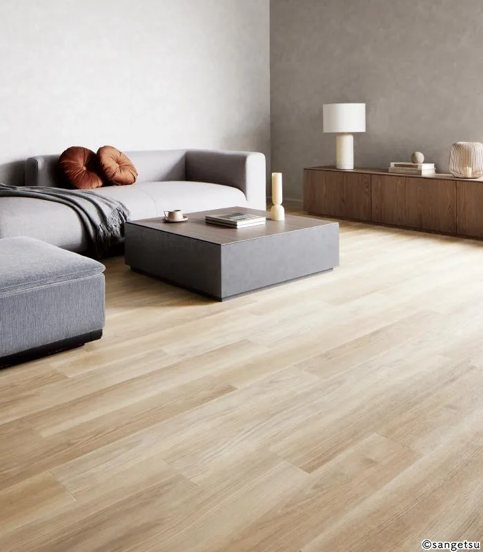 ほのかにさくら色を感じる木目が特長のクッションフロアです。自然な木目柄が、無垢材のような素朴な雰囲気を醸し出してくれます。素足で歩いたときのベタつき感を和らげるための加工が施されているほか、表面に付着した細菌の増殖を抑制する抗菌効果も備えています。