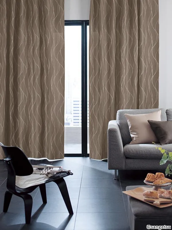 浮かび上がる光沢のある縦流れ柄がアクセントのドレープカーテンです。シックなカラーがモダンな雰囲気を演出します。遮光3級のため、夜間に室内の光が漏れるのを軽減したい方にもおすすめです。