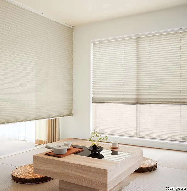 機能性繊維を使用し、遮熱効果を高めたプリーツスクリーンです。ペールトーンから濃色まで使いやすいカラーラインアップも魅力です。和の雰囲気に違和感なく馴染みつつ、すっきりと洗練した雰囲気を演出します。