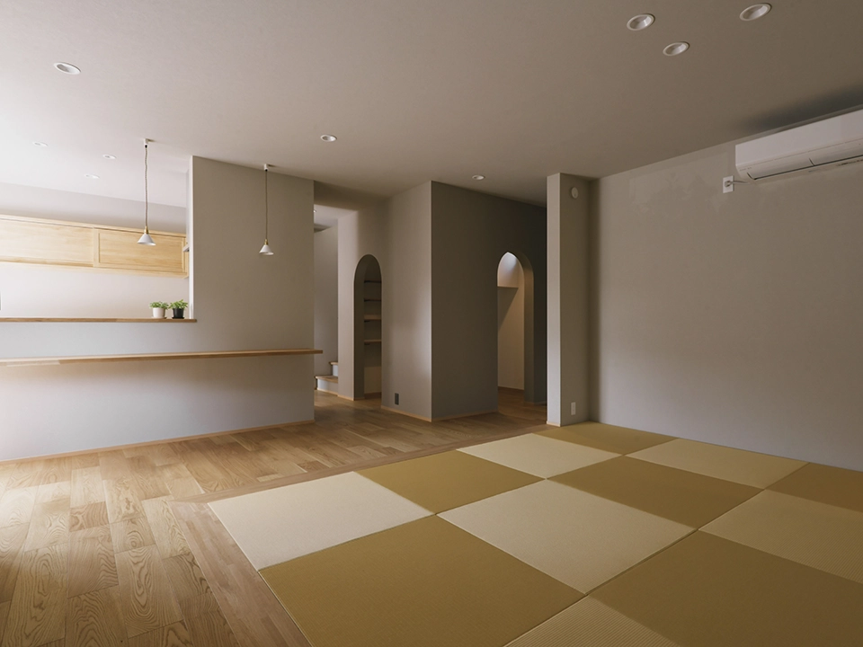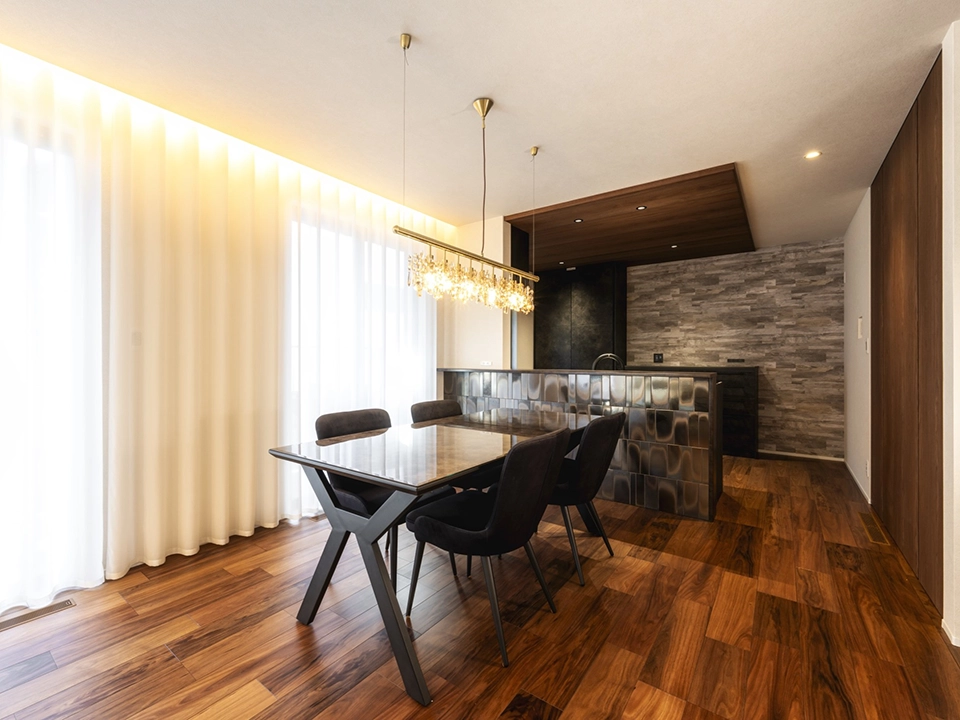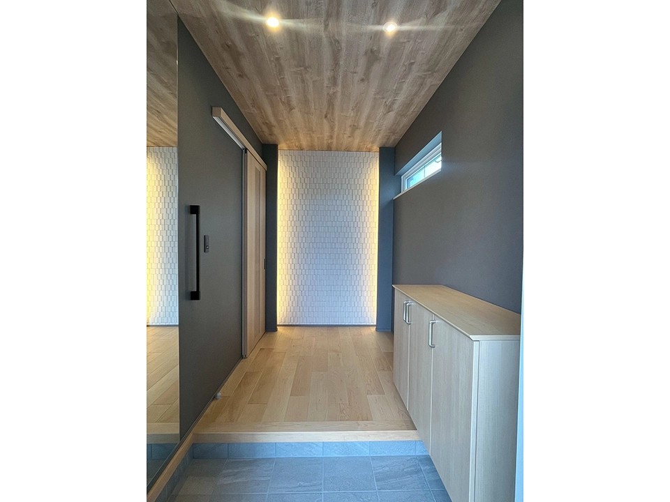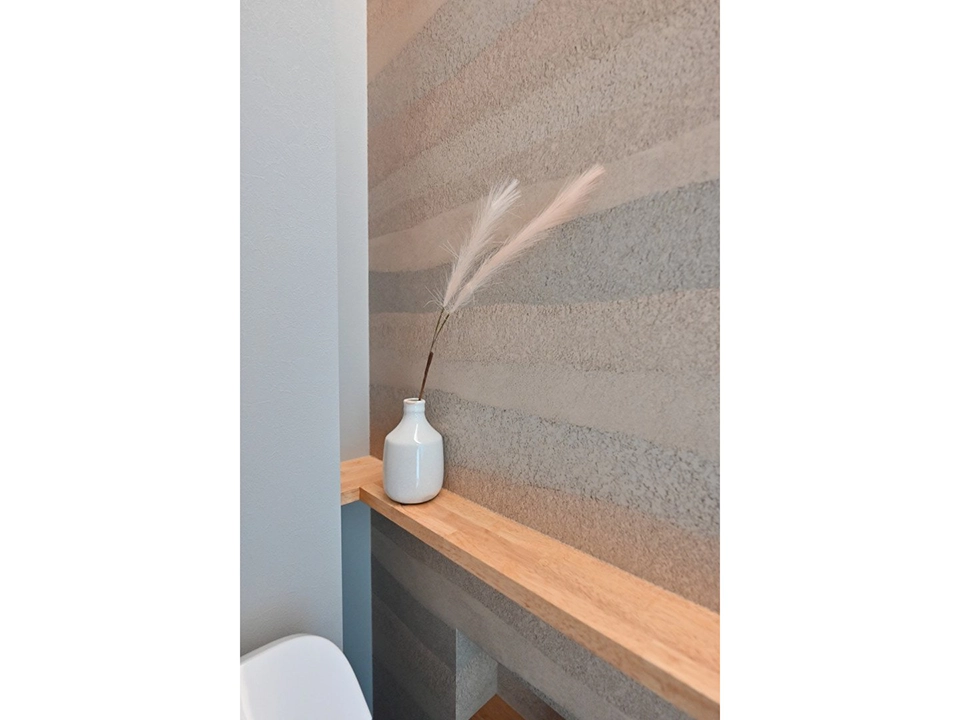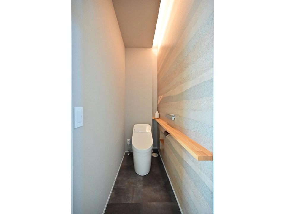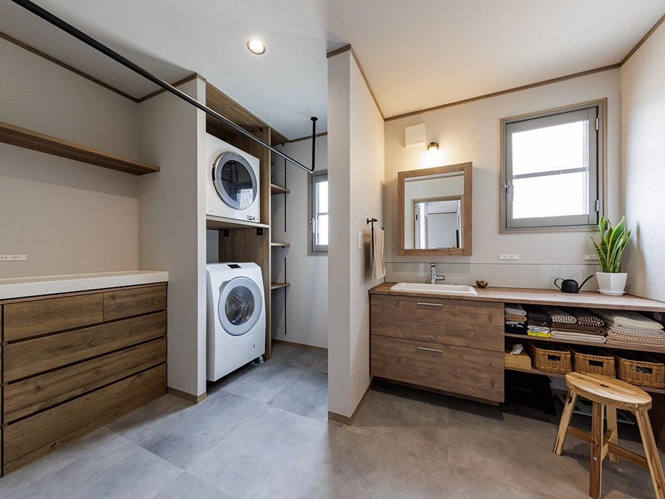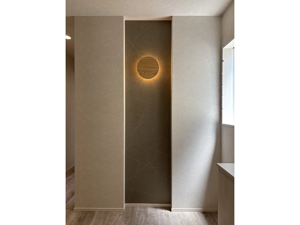 シンプルで落ち着きのあるモノトーンを基調に、天然木の柄を上手に採用。台所天井はあえて段差を付けアクセントに。洗面室は家事室としても使えるよう広く設計し、雨の日も室内干しが可能。和室は上品でくつろぎの空間演出をするため収納を浮かせ照明を設置。
