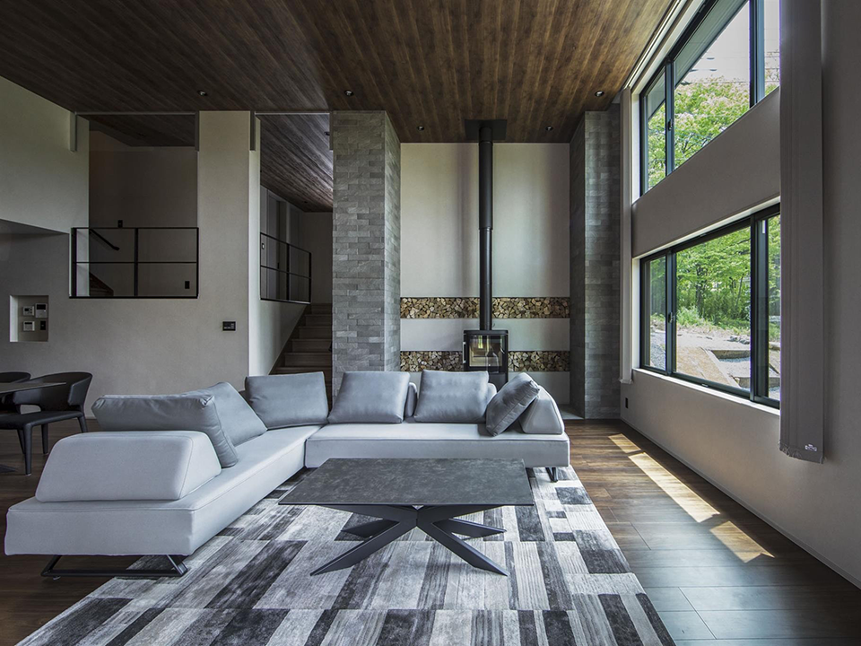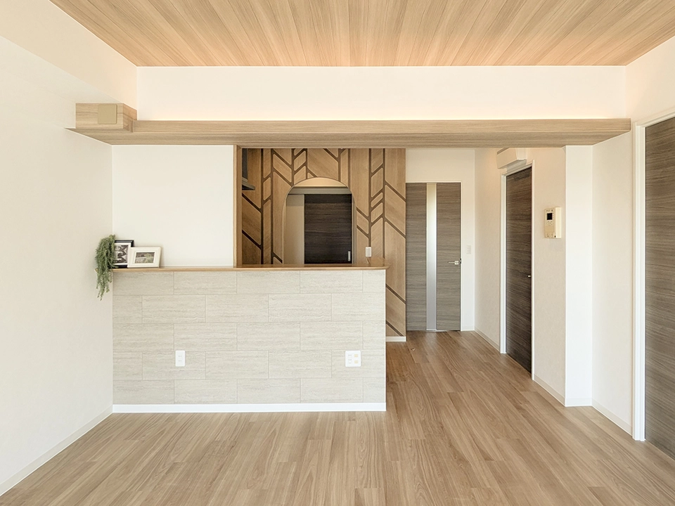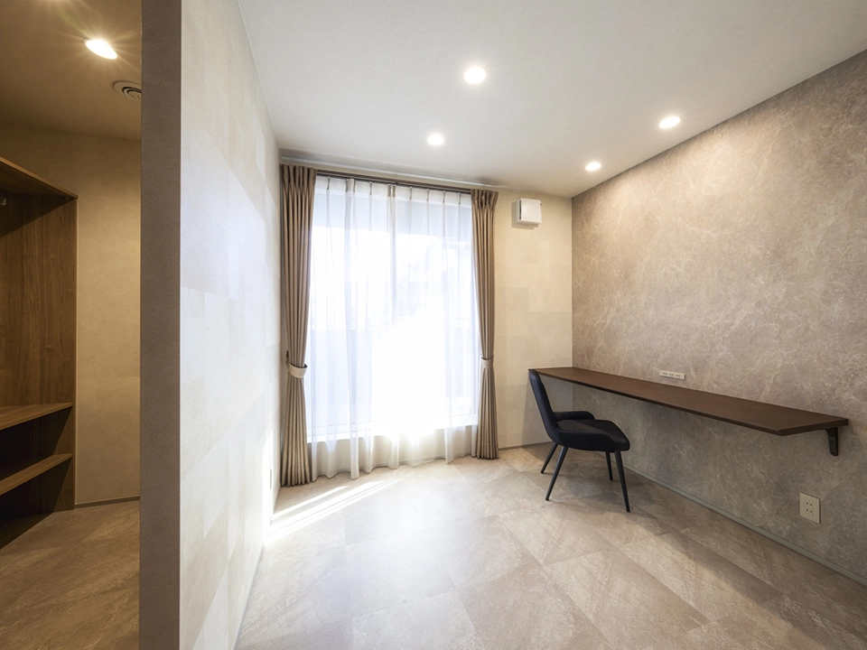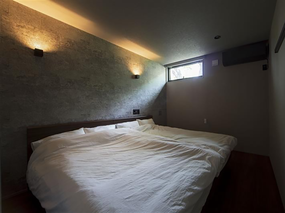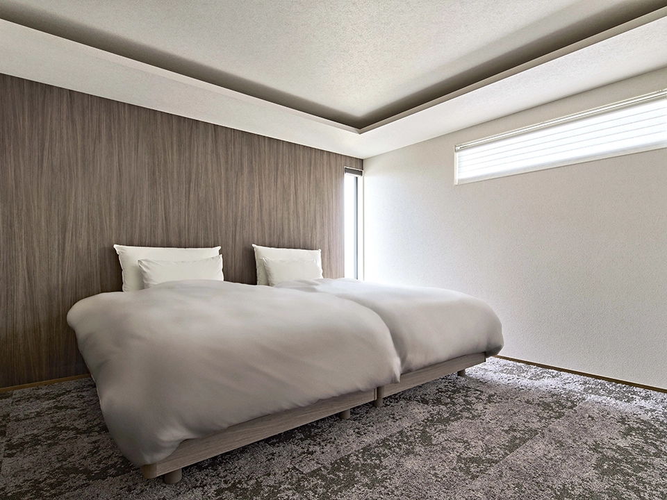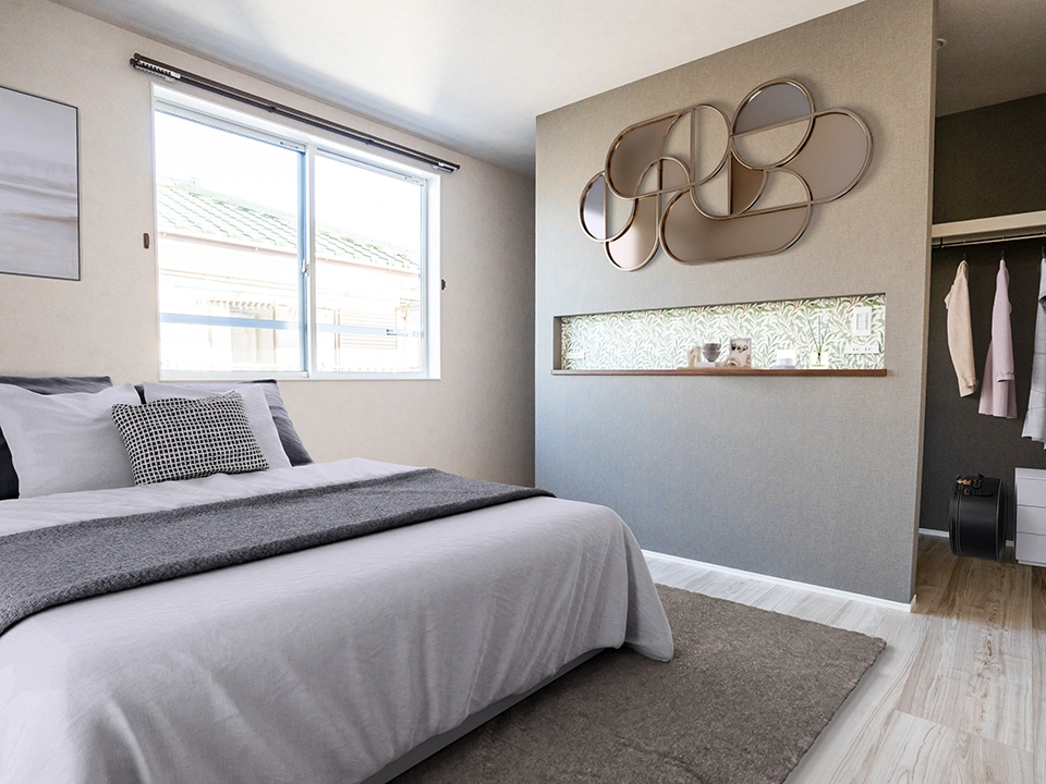 自然に溶け込み調和する心地よい住まい。床と天井の色合いを合わせることでより洗練された空間としています。寝室は高級感も出しつつ、落ち着きのあるタイル調のアクセント壁で演出しています。