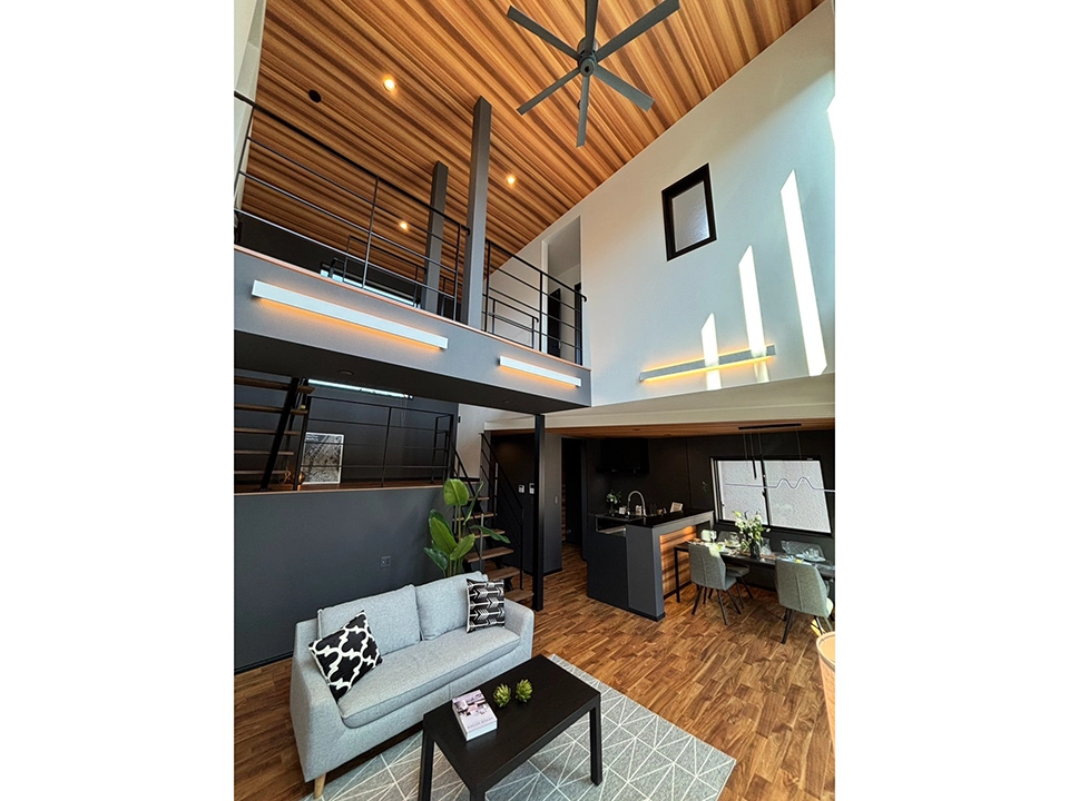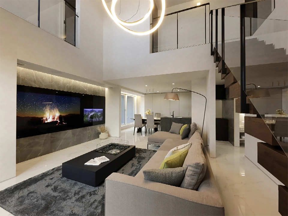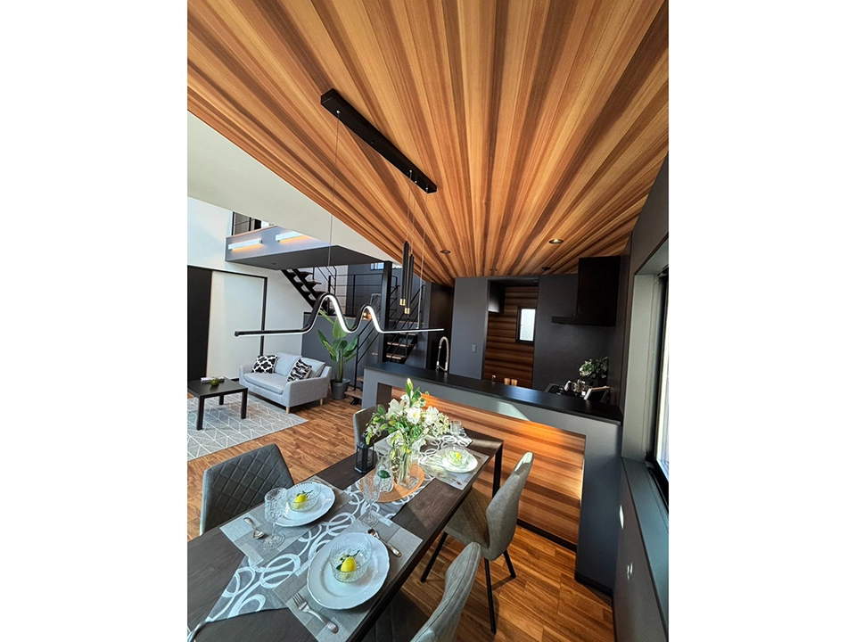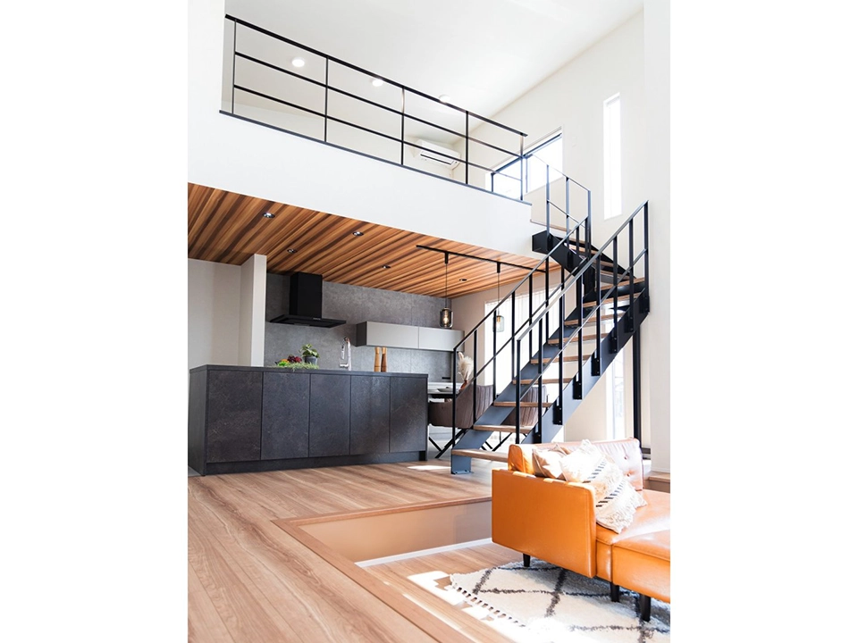 「家族がつながるスカイリビング」吹き抜けによる上下のつながりを重視し、2階まで視線が届く安心感。木目天井の温もりと吹き抜けが生む圧倒的な解放感。渡り廊下が空間を立体的につなぎ、コミュニケーションが自然に生まれる空間に仕上げています。