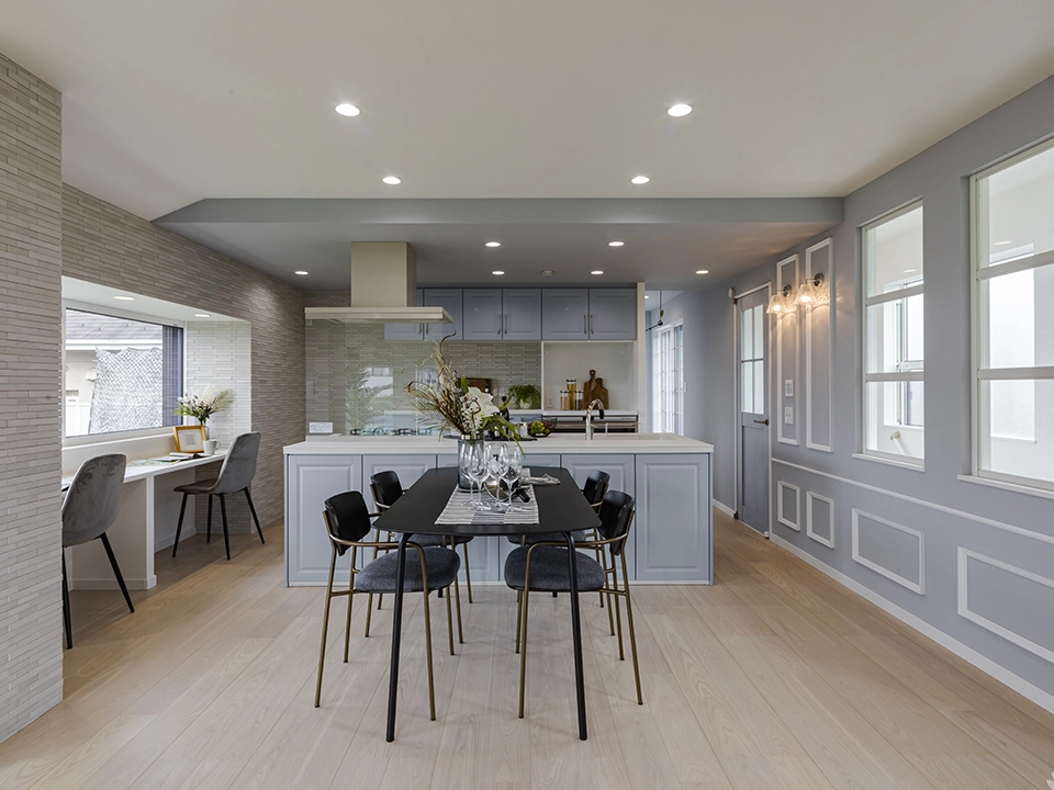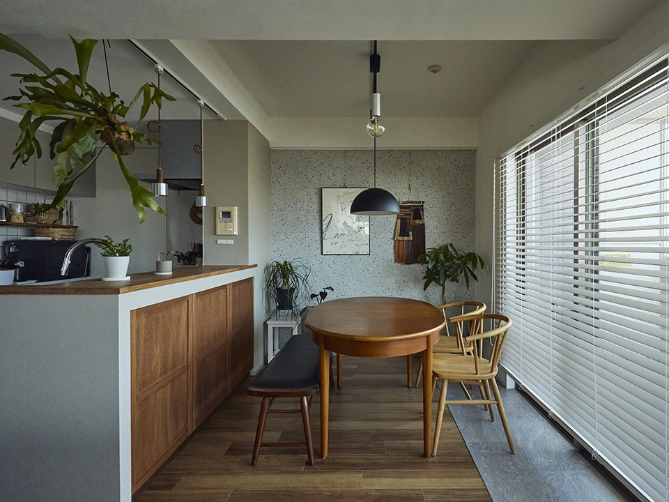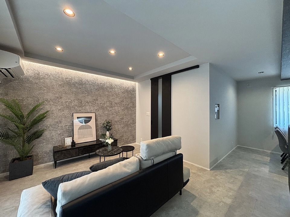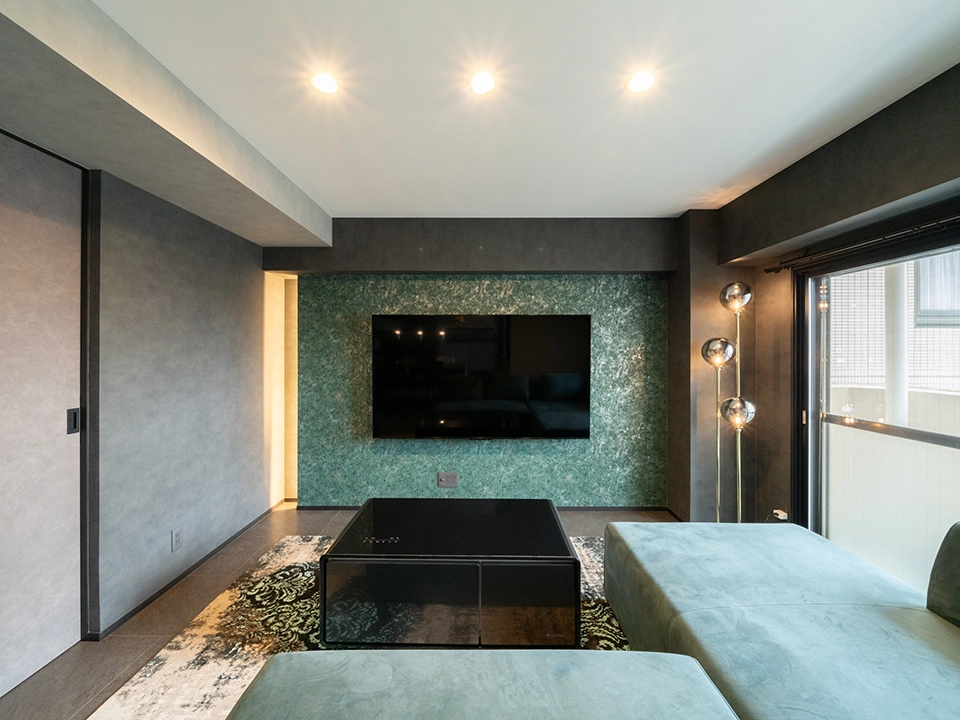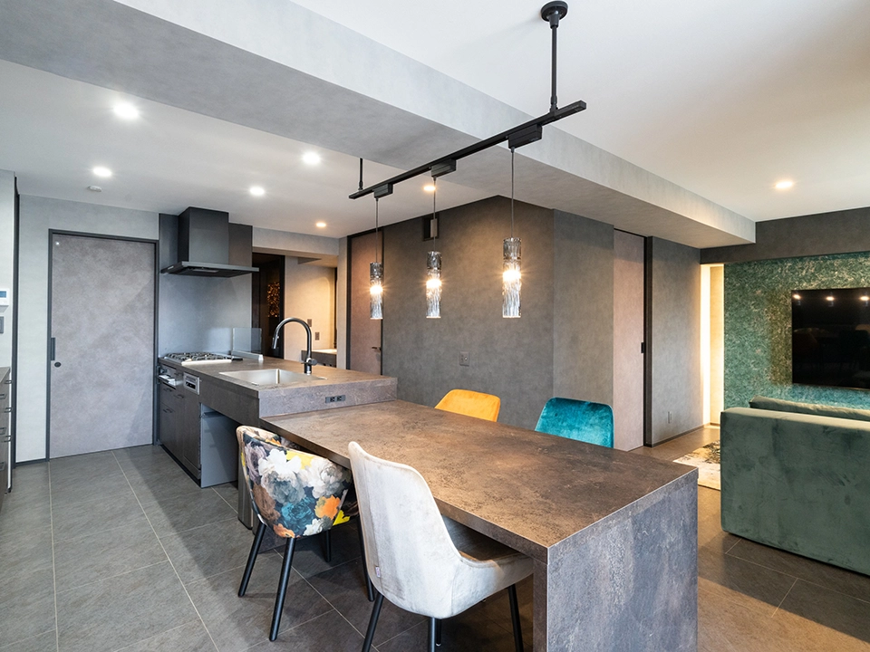 グレーの壁紙で空間全体に洗練された静けさと統一感をもたらし、リビング側の深みのあるグリーンのアクセントクロスで自然の温もりと安らぎを添えることで、モダンでありながら心地よく過ごせるバランスの取れた空間を目指しました。