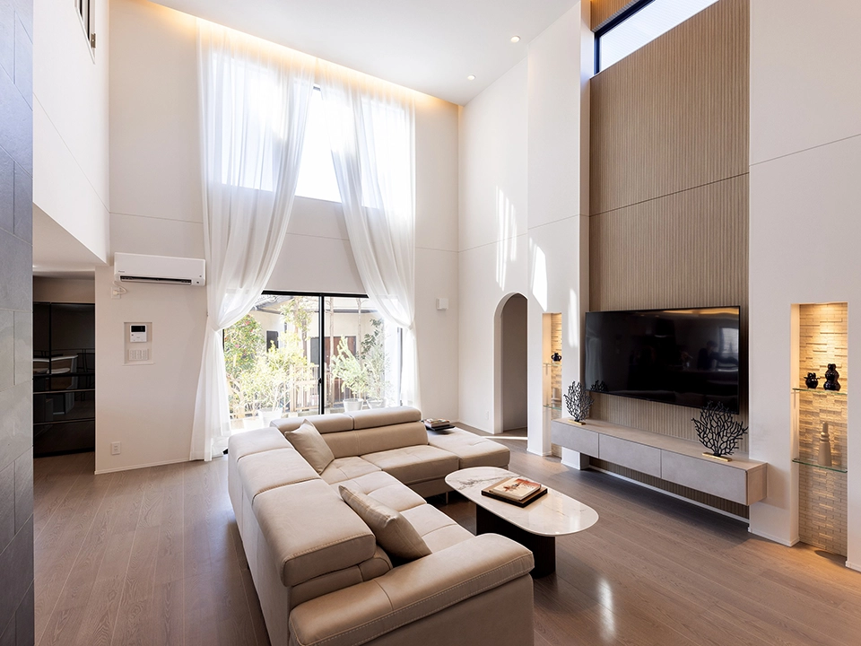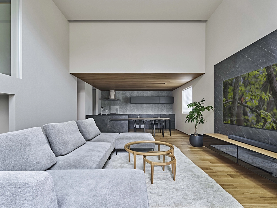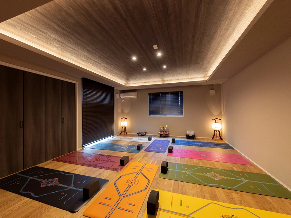 ご家族全員がヨガを楽しむため、併設したヨガ教室は和を感じる落ち着いた色彩を採用。LDKはグレージュを基調としながら吹き抜けの天井までつながるリビングのデザインが特徴です。愛猫と過ごす寝室はあえて天井を下げてリラックス感を演出しています。