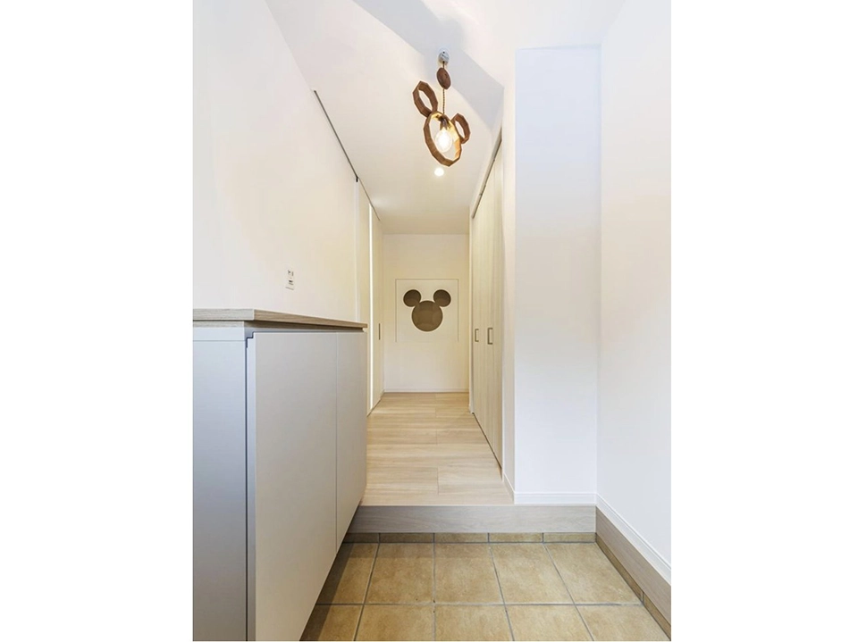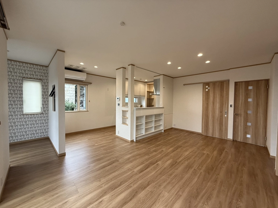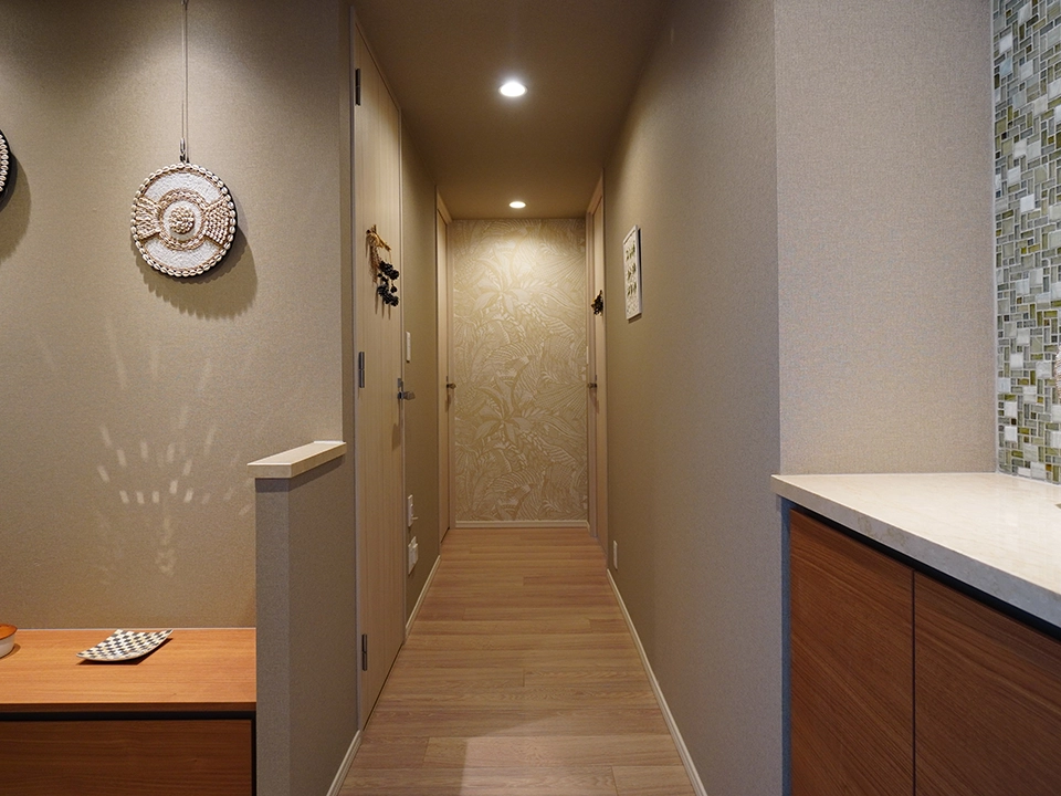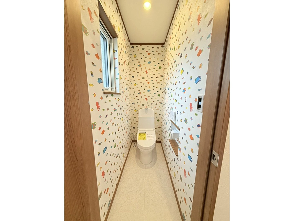 トイレはカラフルで海の生き物が描かれたクロスを使用し思わず笑顔になるような雰囲気を作り、子供から大人まで楽しめる空間を演出しました。LDKはナチュラルでシンプルな空間に別部屋へ繋がる動線に猫柄のクロスを使い空間を分けました。