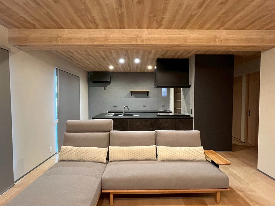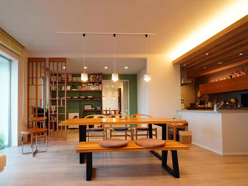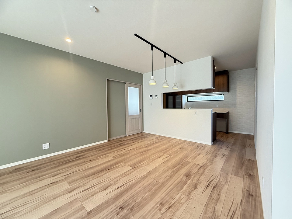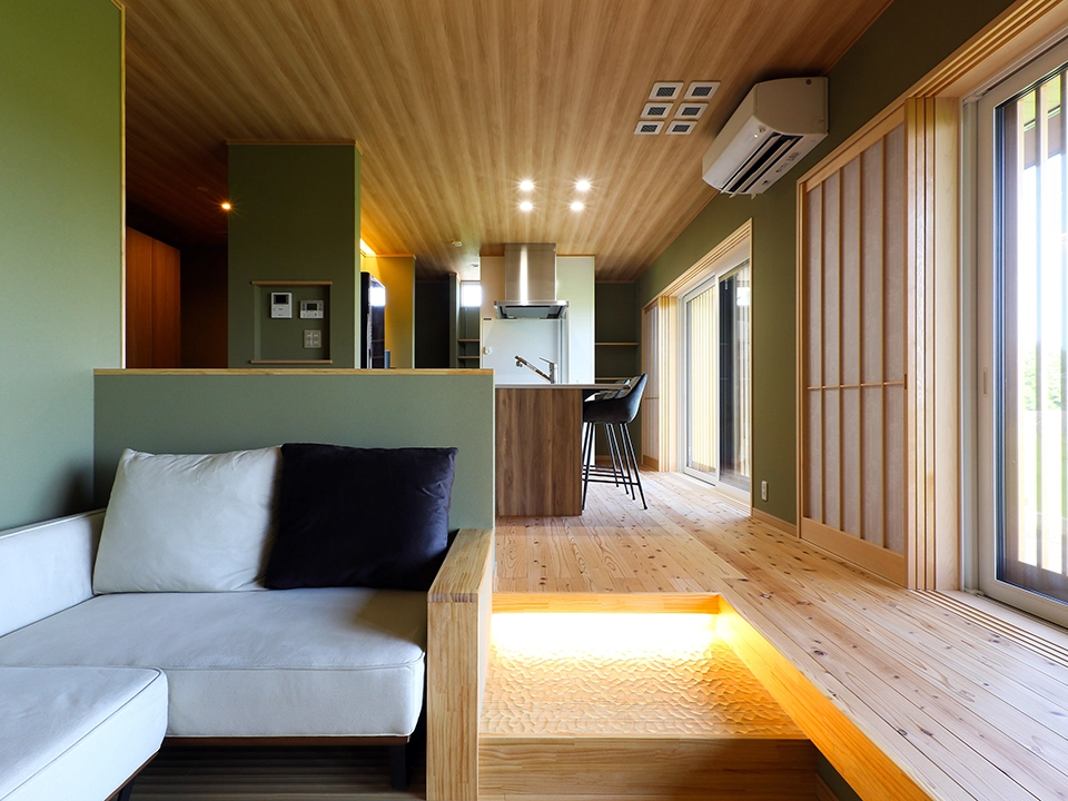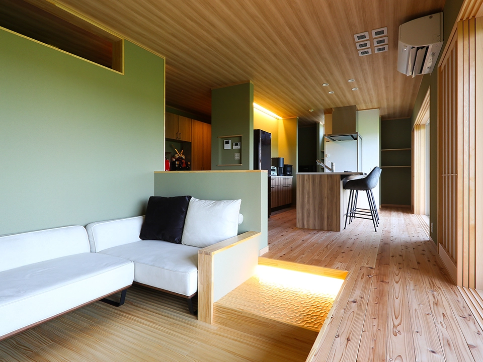 和がお好きなお客様です。無垢の木(杉)の床と、グリーンの珪藻土クロスをメイン空間に使い、より自然を意識した内装のイメージです。天井も木目を選んだことで落ち着きのある空間に仕上がりました。