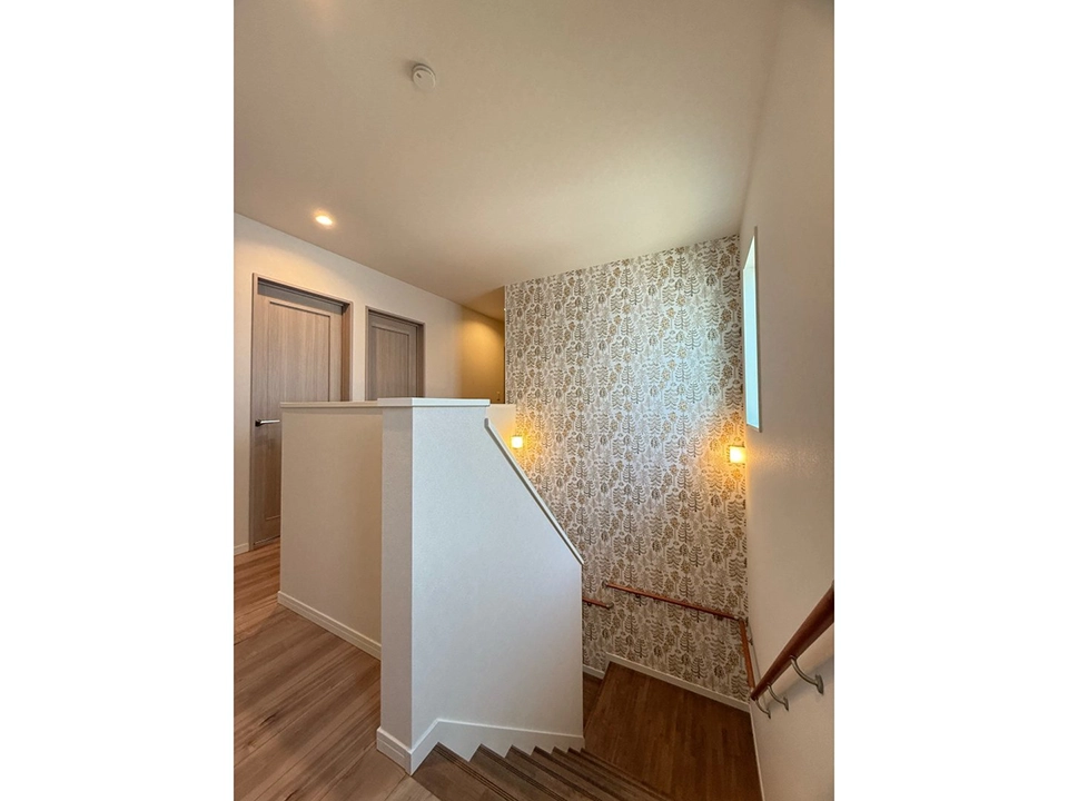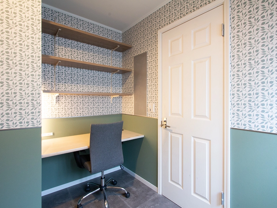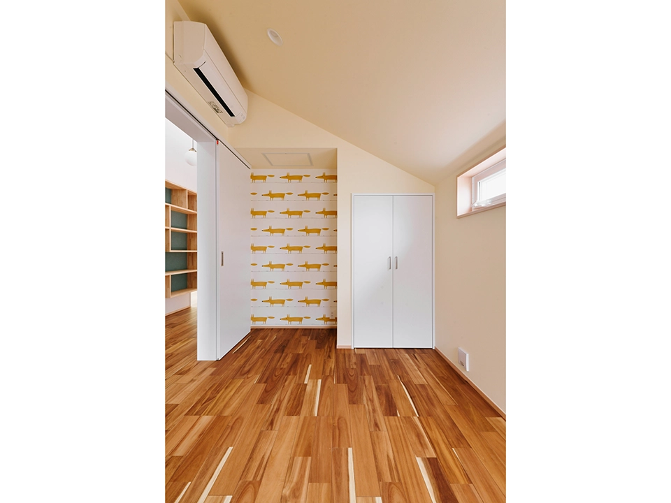 ナチュラルな木のぬくもりにアクセントでグリーンの壁紙を採用し、遊び心をプラスしました。自然光が優しく差し込み、シンプルながらも彩り豊かな壁紙が暮らしに安らぎをもたらします。お子様部屋にはかわいいきつね柄の壁紙を採用しました。