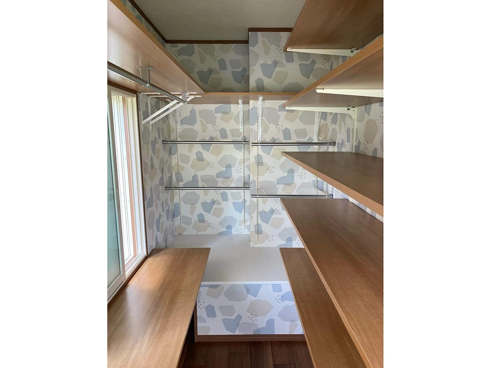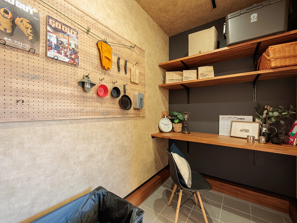 小上がりと納戸が大活躍!生活スタイルに合わせてお部屋を大改造!納戸には上着、生活雑貨、備蓄品、趣味の山登りグッズなど、たっぷりと収納できる棚を設置し、その壁面に遊び心のあるムーミンクロスをセレクトしました。目に入る度にワクワクする空間です。