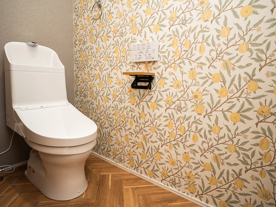 奥様の要望でモリスクロニクルズをメインに採用。ただあまり派手すぎない様にしたいという要望からリビングには使用しないでトイレ、寝室の一部に使用。リビングは明るくナチュラルな風合いに、寝室は重厚感ある雰囲気に仕上げました。
