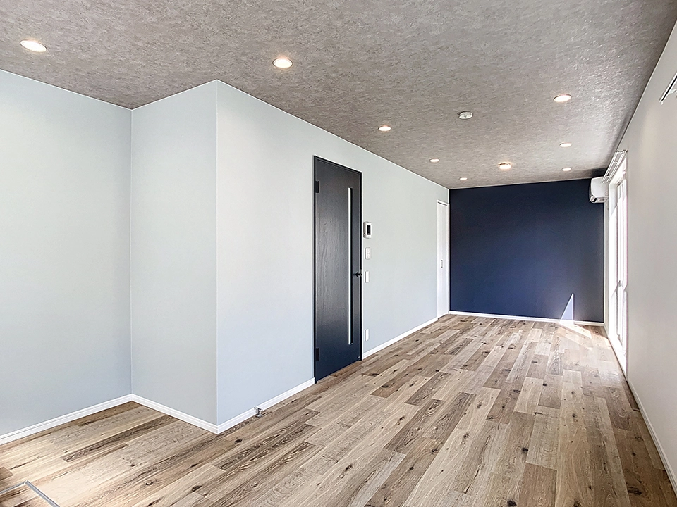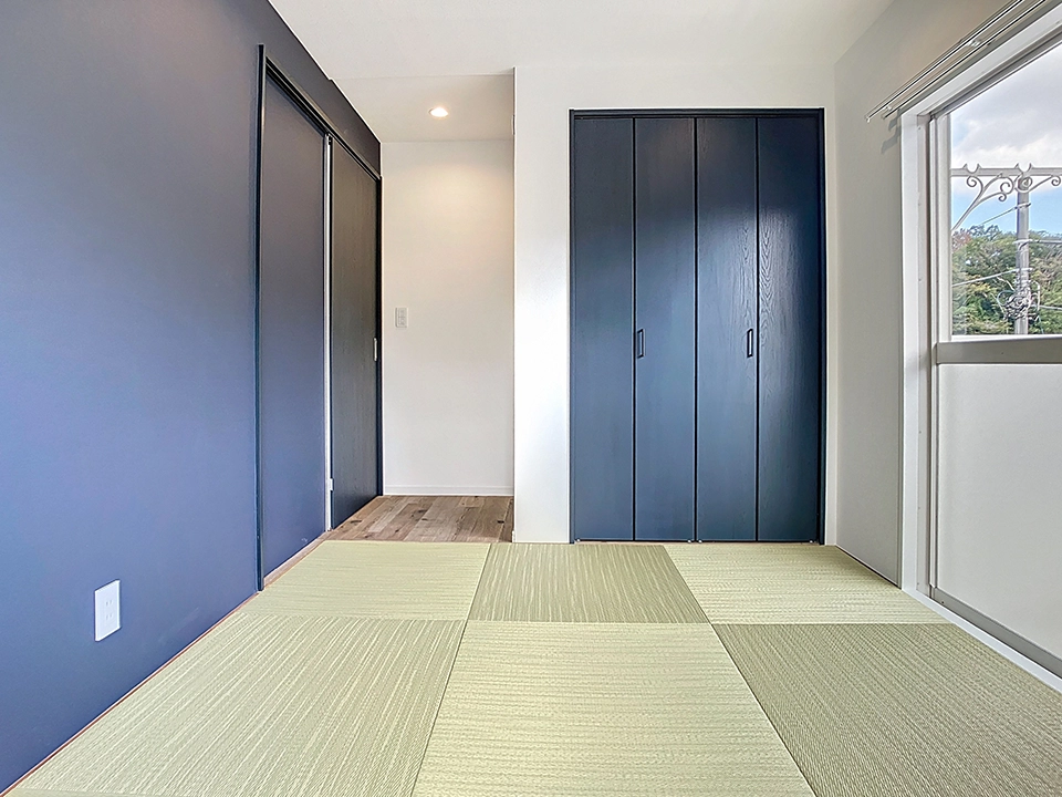 最新和モダンの誕⽣。ネイビーをシンボルカラーに和室を残した賃貸リノベ。築30年のテラスハウスをフルリノベーション。琉球畳を敷いた和室は建具とアクセントクロスのネイビーで落ち着いた空間に仕上がりました。