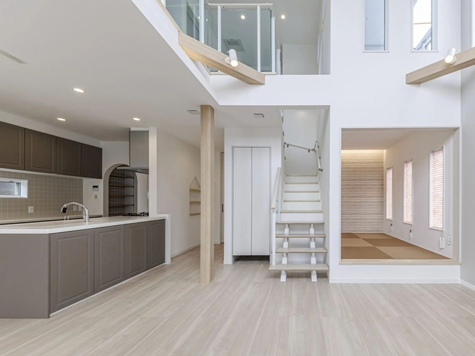 白を基調としたクロスが光を受け止め、吹き抜け全体に明るさを拡散する。余白を活かしたミニマルな空間構成。シンプルだからこそ際立つ、素材の質感と光の表情。