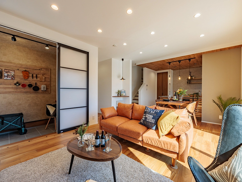 二世帯住宅で1, 2階の建材カラーは別々ですが全体的にジャパンディを意識し、1階は「和テイスト」・2階は「北欧テイスト」をコンセプトにコーディネート。使用面積の多いアクセントもアースカラーベースの為、存在感を放ちつつも空間に馴染んでいます。