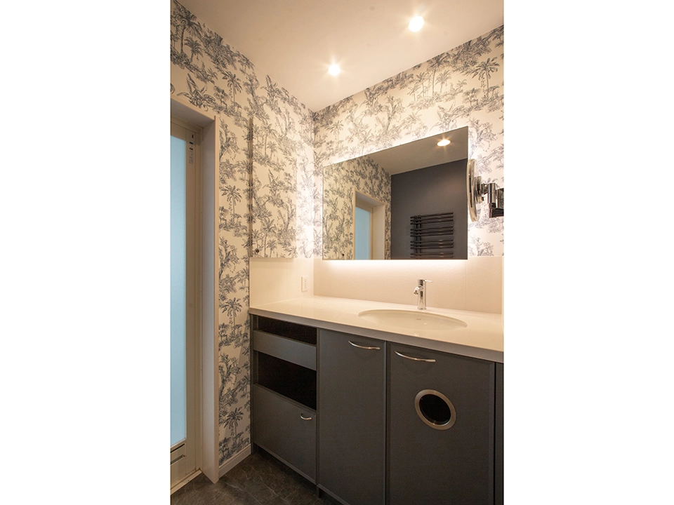英国風を好まれるお客様のため、伝統柄クロスやモールディング、表情ある石目柄の床で海外のような空間を演出。洗面室はクロスの柄に合わせた穏やかなブルーでまとめ、書斎は英国の庭をテーマにコーディネートした。