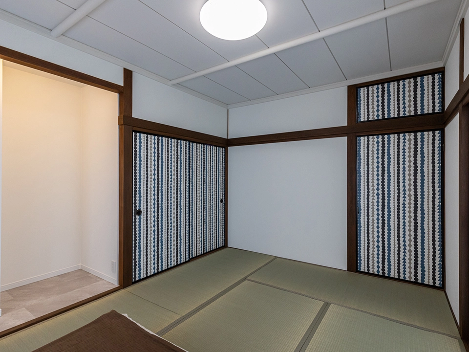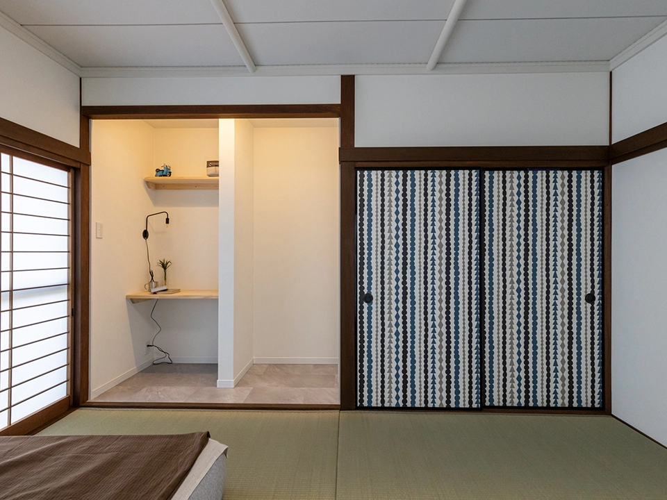 元は平屋のこだわりを感じられる物件でした。元々あるものを活かしつつ、和室の床間をワークスペースにするなど現代の生活様式に合わせてリノベーションしました。北欧のキッピスのクロスを襖に使用し、畳の部屋をモダンな印象に仕上げることができました。