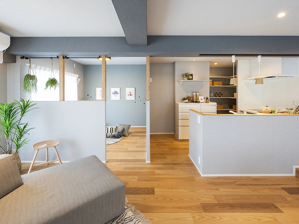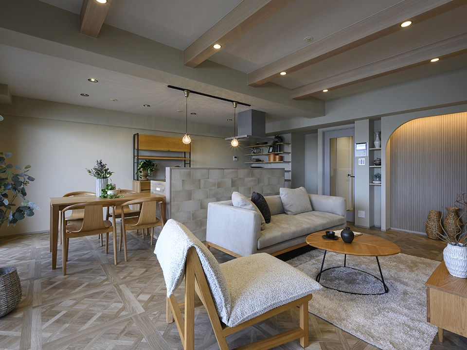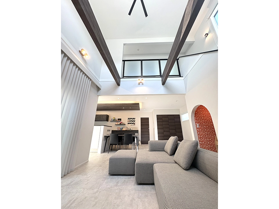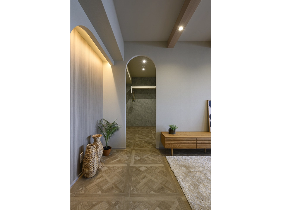 流行のジャパンディを空間全体で表現しました。LDKにアーチの壁を作ってリブ調のクロスをアクセントに選びました。