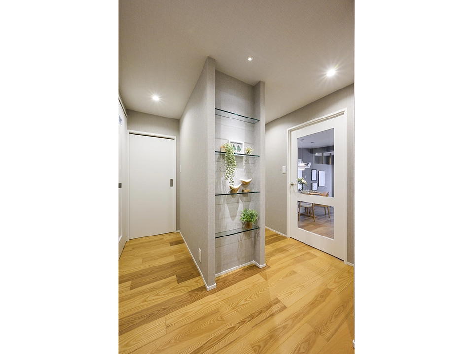 リビングのクロスは3色を使い分け、奥行きを感じる空間としました。さらに、同タイプのテクスチャを選定することで、統一感を出しています。その上で、木材やガラス素材などと組み合わせることで、アイキャッチポイントを演出し、優しい空間を実現しました。