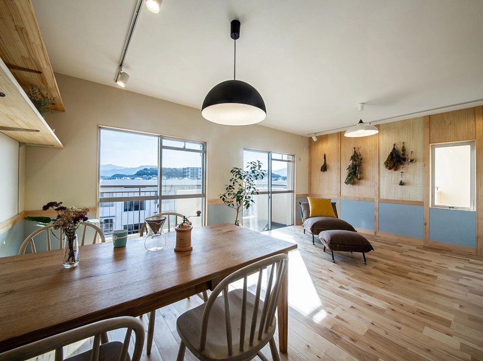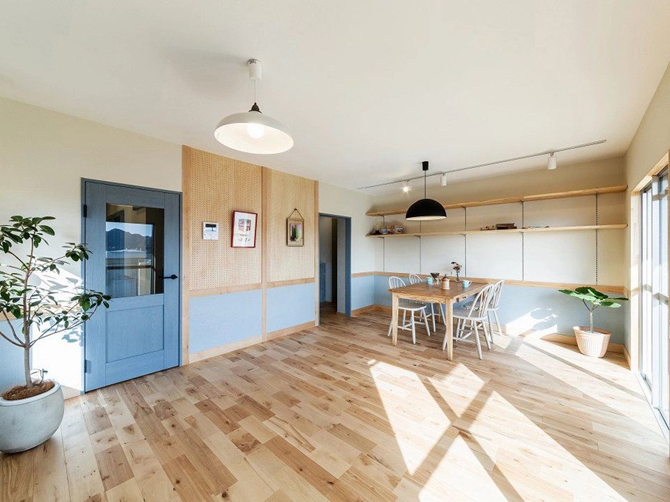アクセントとして淡いブルーのクロスを採用。自然光との相性や建具の色合い、木目とのバランスを考慮し、空間全体のトーンを整えている。5階住戸という条件に対し、色彩計画によって付加価値を与え、日常の中で心穏やかに過ごせる空間となるよう計画した。