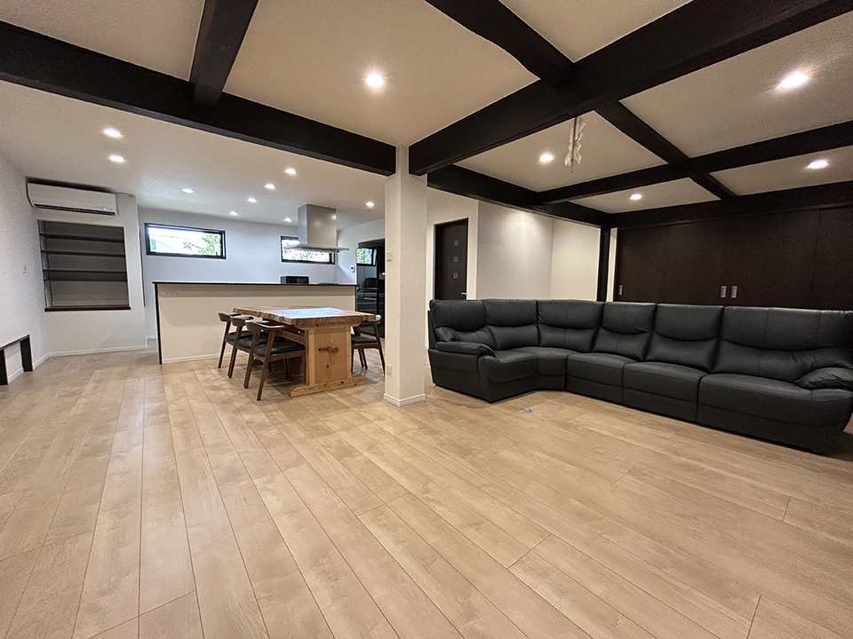 築70年の古民家をソフトモダンな家へリフォーム。 シンプルな印象を持たせるためアクセントクロスは用いず白で統一し、木目や照明の温かさにも合うよう暖色味のある白を採用しています。古民家の雰囲気を残しつつも新たな一家団欒の場が出来上がりました。