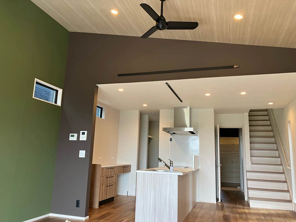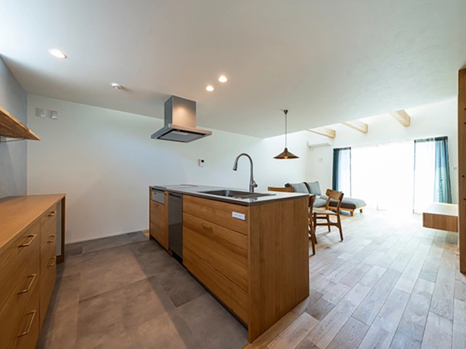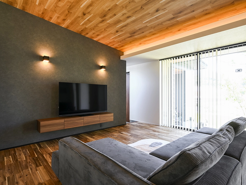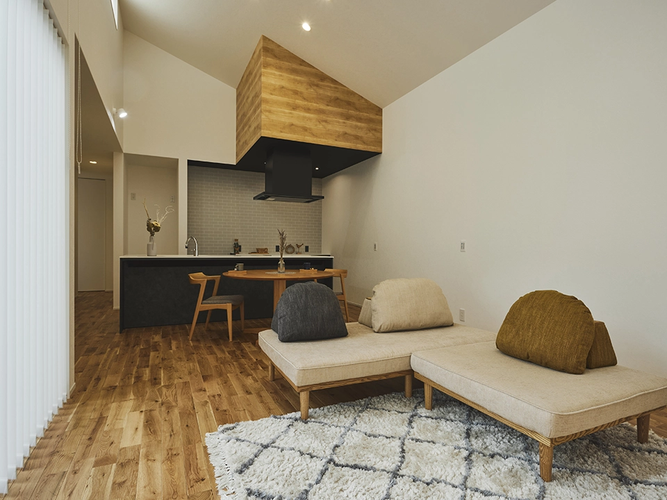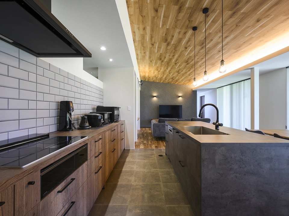 温かみのある木目とモダンな石目が美しく調和したLDK。勾配天井には直接的な光を避け、間接照明を採用しました。天井を優しく照らす光が、木の豊かな表情を引き立て、家族がくつろぐ上質な温もりの空間を演出します。