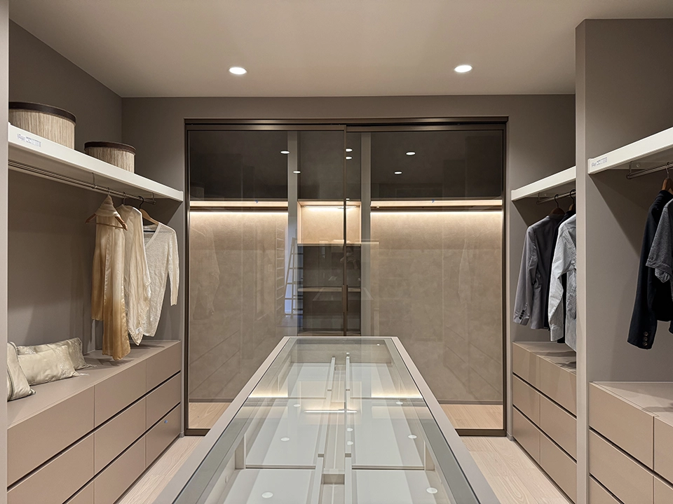 ニュアンスカラーを基調に空間全体を穏やかに整えつつ、部屋ごとにわずかにトーンを変えることで、自然な変化と心地よいリズムをつくりました。黒や純白を極力避けることで、強いコントラストが生まれず、柔らかく包み込むような雰囲気に仕上がっています。