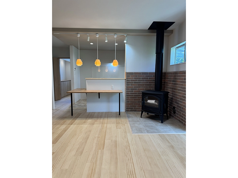 70代ご夫婦、老後ゆっくり過ごすためのセカンドハウスです。LDKを日当たりのいい和室に移し奥様念願の無垢のフロアと薪ストーブを設置。キッチン下がり天井のクロスは圧迫感がなくアクセントになる絶妙な色味のものを選択。北欧調に仕上げました。