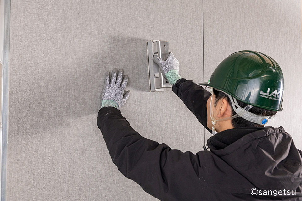 壁紙施工の品質は、下地補修(パテ処理)や糊付けといった、内装施工事業者(以下、職人)の手作業によって支えられています。しかし限られた工期の中、こうした「人の手」を必要とする工程の多さは、職人の高齢化および人手不足と相まって現場の大きな負荷となっており、今後も長期的に高い品質を維持し続けることは困難になりつつあります。また、電動工具によるビス打ちの作業音や、粉塵の発生も現場環境に影響を与えており、テナント改修時などにおける大きな課題となっていました。