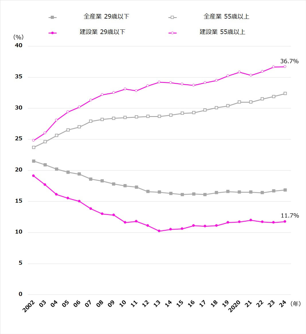 建設業就業者の高齢化の進行 出典:総務省「労働力調査」