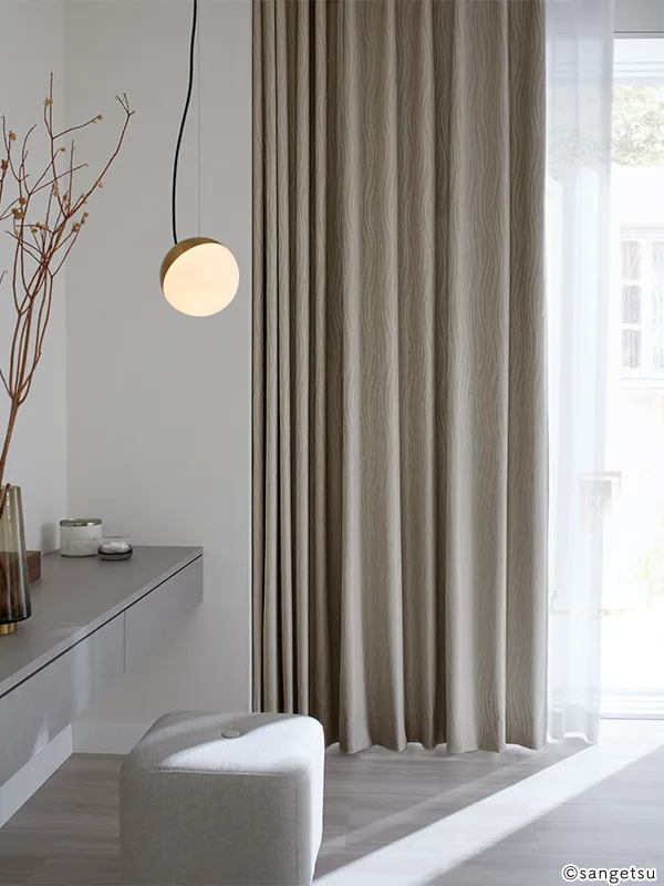 ナチュラルに仕上げた縦流れ柄に、コーティングを施した遮音カーテンです。さりげない流れ柄が上品な雰囲気を醸し出します。シンプルなお部屋のコーディネートはもちろんのこと、和モダンのテイストにもよく馴染むでしょう。遮音機能に加え、遮光・防炎機能も備えたカーテンとして、幅広いシーンでご活用いただけます。
