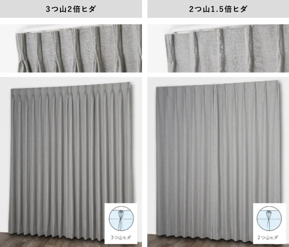 ドレープカーテンの特長であるヒダには、いくつかの種類があります。代表的なものとして挙げられるのが「3つ山2倍ヒダ」と「2つ山1.5倍ヒダ」です。